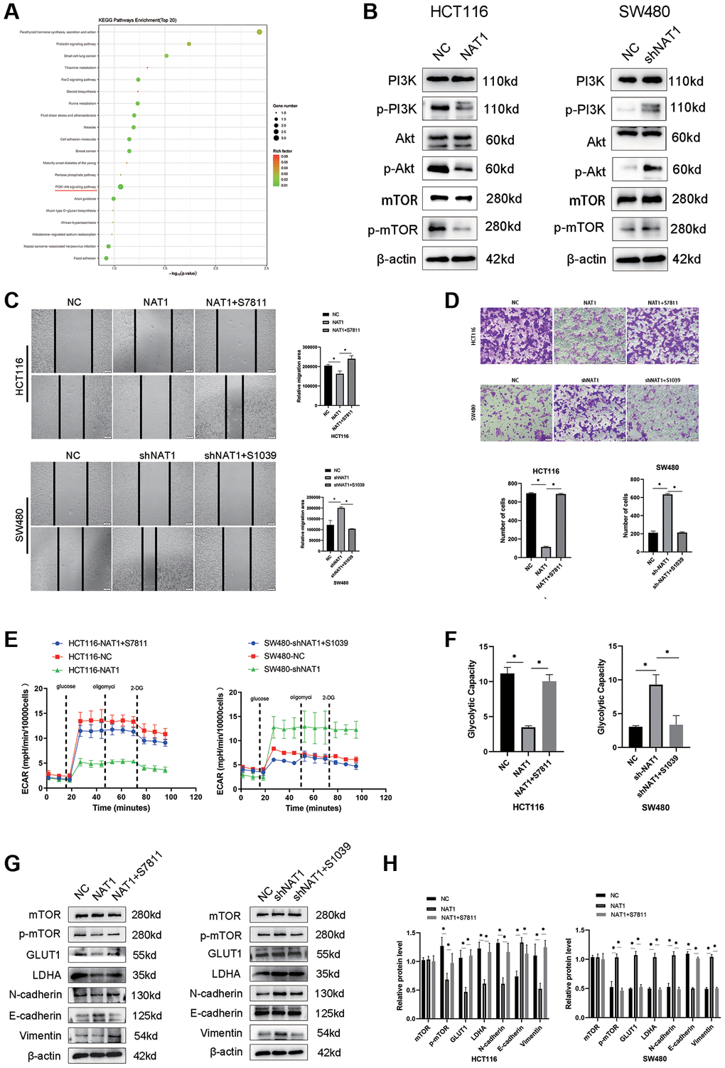 We performed transcriptome sequencing on the NAT1 overexpressed HCT116 cell line (Figure 4A). The PI3K/AKT/mTOR pathway plays an important role in EMT and glycolysis of tumor cells. Our transcriptomic results showed enrichment in the PI3K/AKT/mTOR pathway, followed by WB experiments to verify that overexpression of NAT1 inhibited the PI3K/AKT/mTOR pathway (Figure 4B). To test whether NAT1 regulates EMT and glycolysis in colorectal cancer cells through the PI3K/AKT/mTOR pathway. Adding mTOR agonist (S7811: MHY1485) to HCT116-NAT1 significantly restored cell migration and glycolysis ability (Figure 4C–4F). The addition of a mTOR inhibitor (S1039: rapamycin) to SW480-shNAT1 cells significantly inhibited cell migration and glycolysis ability (Figure 4C–4F). Moreover, the introduction of the mTOR agonist (MHY1485) to HCT116-NAT1 significantly restored the expression of GLUT1, LDHA, N cadherin, and Vimentin, while promoting the expression of E-cadherin (Figure 4G, 4H). This effect was reversed by adding the mTOR inhibitor (rapamycin) to SW480-shNAT1 cells (Figure 4G, 4H). These results further demonstrate that NAT1 inhibits the EMT and glycolysis ability of colorectal cancer cells through the PI3K/AKT/mTOR signaling pathway, thereby suppressing the proliferation and metastasis of colorectal cancer.