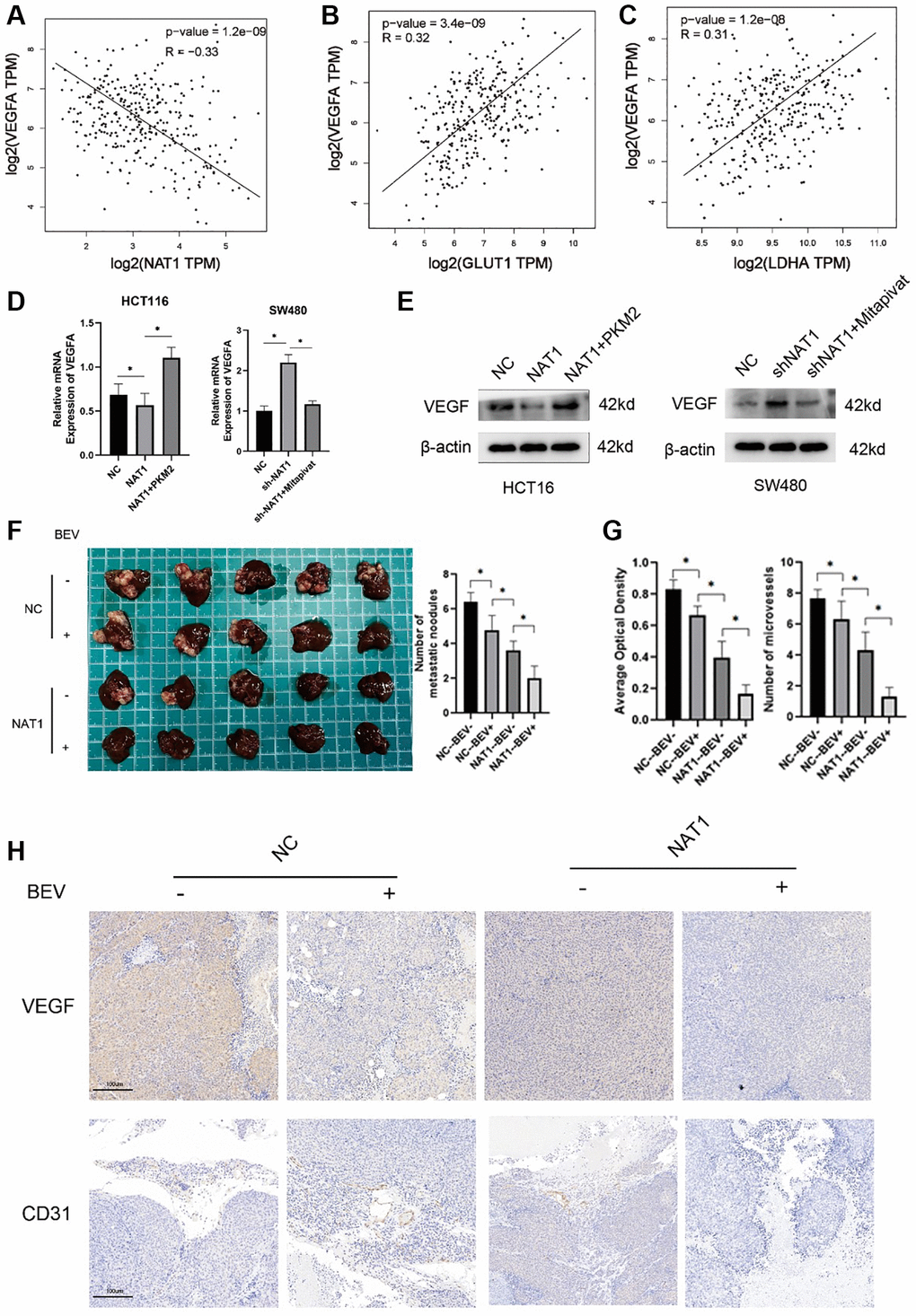 Figure 5F animal experiments were divided into four groups: HCT116-NC, HCT116-NC+bevacizumab, HCT116-NAT1 and HCT116-NAT1+bevacizumab. Each mouse in each group was injected with 2 × 106 cells in the spleen of each mouse.