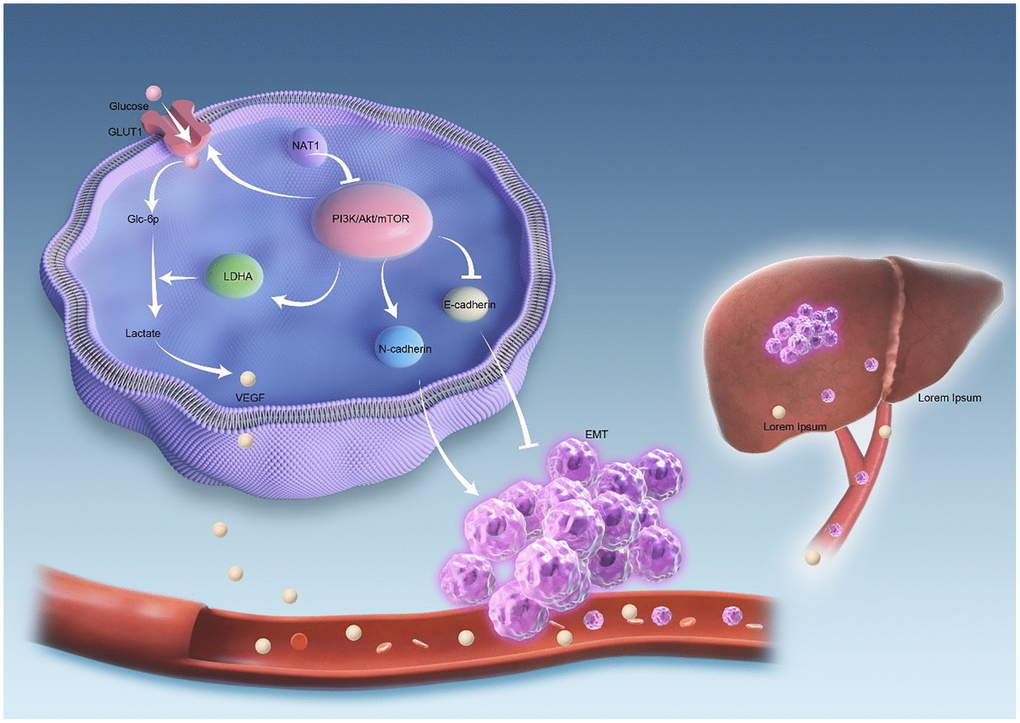 Figure 6 illustrates the mechanism investigated in this study. The overexpression of NAT1 is shown to inhibit the PI3K/AKT/mTOR signaling pathway. Firstly, NAT1 overexpression inhibits the occurrence and progression of epithelial-mesenchymal transition (EMT) in tumor cells. Additionally, NAT1 weakens the glycolytic ability of colorectal cancer cells by suppressing the expression of GLUT1 and LDHA. This reduced glycolytic capacity leads to decreased expression of VEGF in colorectal cancer cells, which in turn reduces neovascularization and vascular permeability in liver metastases, ultimately resulting in a decreased occurrence of liver metastasis. Therefore, it can be inferred that NAT1 suppresses liver metastasis of colorectal cancer by modulating EMT and glycolysis in colorectal cancer cells through the PI3K/AKT/mTOR signaling pathway (Figure 6).