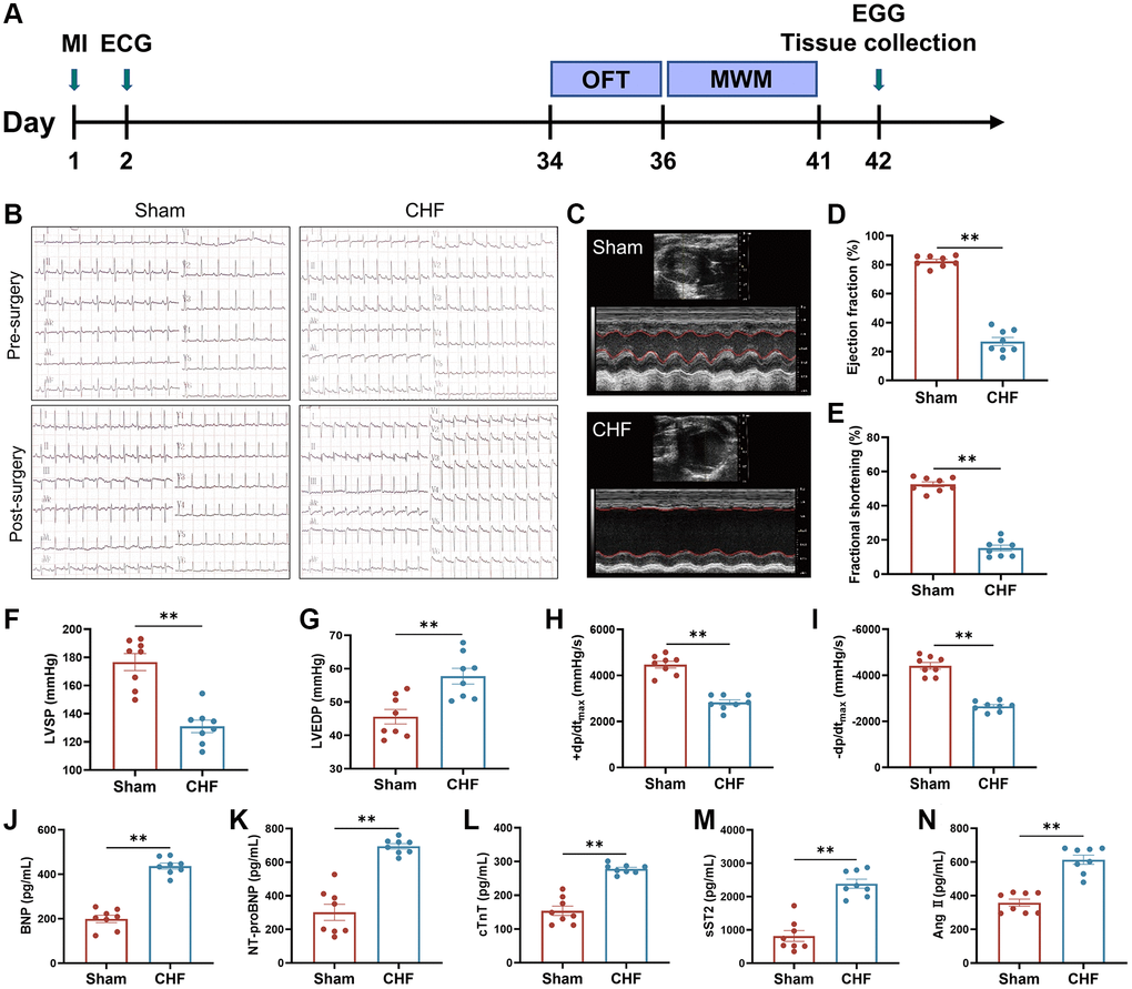 Figure 1A presents the timeline of the experiment. The results of electrocardiography, displaying pathological seven Q-waves, confirmed the successful construction of the MI models (Figure 1B). In order to examine the cardiac function of rats with CHF six weeks after MI, echocardiography was utilized to measure LVEF and LVFS to assess myocardial contractility. The results showed that the CHF group exhibited a significant decrease in LVEF and LVFS compared to the Sham group, suggesting that MI had a detrimental effect on cardiac function (Figure 1C–1E). These findings were further supported by changes in hemodynamic parameters, as evidenced by a significant decrease in LVSP, +dp/dtmax and −dp/dtmax, respectively, in CHF rats, and a significant increase in LVEDP (Figure 1F–1I).