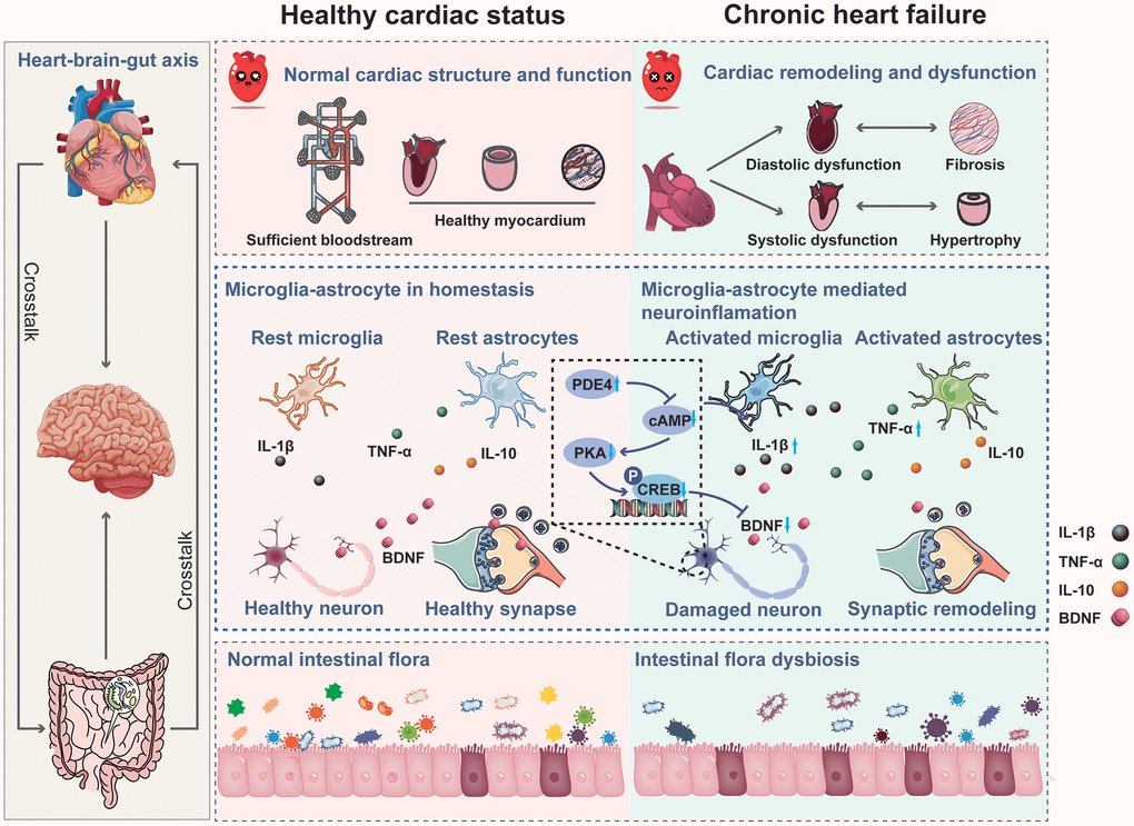 Collectively, our study confirmed that CHF impairs learning and memory in rats by promoting neuroinflammation in the hippocampus and causing intestinal dysbiosis. Neuroinflammation-induced alterations in structural synaptic plasticity may underlie hippocampus-dependent cognitive impairment following CHF, potentially implicating the PDE4-dependent cAMP signaling. Thus, inhibiting neuroinflammation, enhancing neuronal activity in the hippocampus, and improving intestinal flora could be effective therapeutic strategies for post-CHF cognitive impairment (Figure 10).