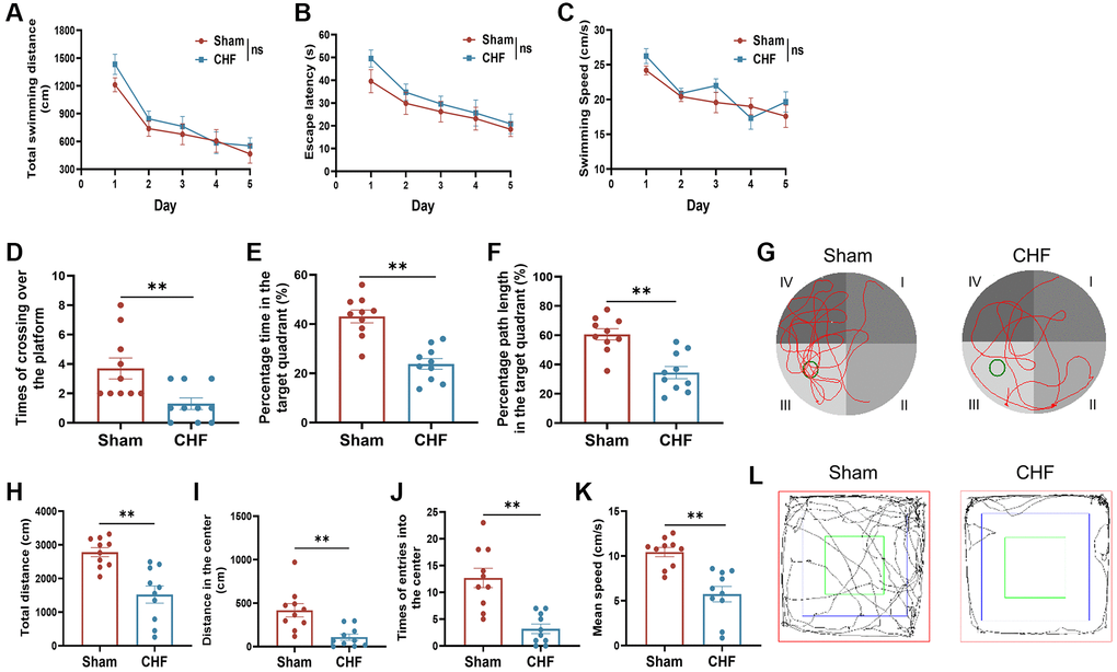 The OFT results demonstrated significant reductions in total distances, distances in the center, number of entries into the center, and average speed of CHF rats when compared to the Sham group (Figure 2H–2L). This suggests that CHF might reduce the locomotor activity of the rats to a certain extent. The results of the behavioral tests above revealed that CHF may be a distraction, which impairs learning and memory function.