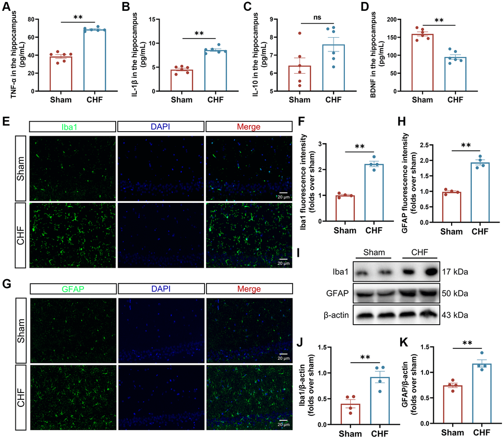 Microglia and astrocytes are the main sources of inflammatory response in the CNS. The assessment of microglia and astrocytes was conducted using both immunofluorescence and Western blot analysis. The Sham group exhibited a low intensity of fluorescence signal in Iba1-positive microglia and GFAP-positive astrocytes, whereas the CHF group displayed an increase in the Iba1 and GFAP signals (Figure 3E–3H). These findings were further supported by Western blot analysis (Figure 3I–3K), which revealed a significant upregulation of Iba1 and GFAP proteins in the CHF group, implying that microglia and astrocytes might be activated by CHF.