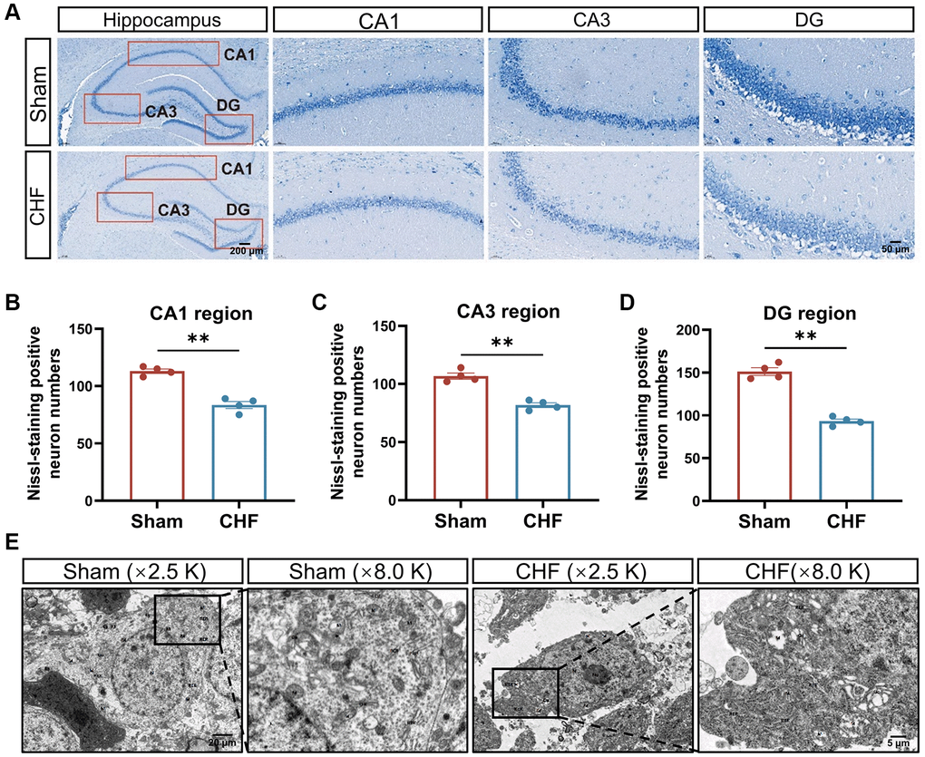 Nissl bodies synthesize structural proteins, neurotransmitter-synthesizing enzymes, and neuromodulatory peptides needed for organelle renewal [42]. Neuronal damage can lead to a decrease, disintegration, or complete loss of Nissl bodies. The Sham group exhibited densely arranged nerve cells with a copious amount of Nissl bodies in the cytoplasm. Conversely, the CHF group displayed a lighter cytoplasm and a slight reduction in the number of Nissl bodies in the CA1, CA3, and DG regions (Figure 4A–4D).