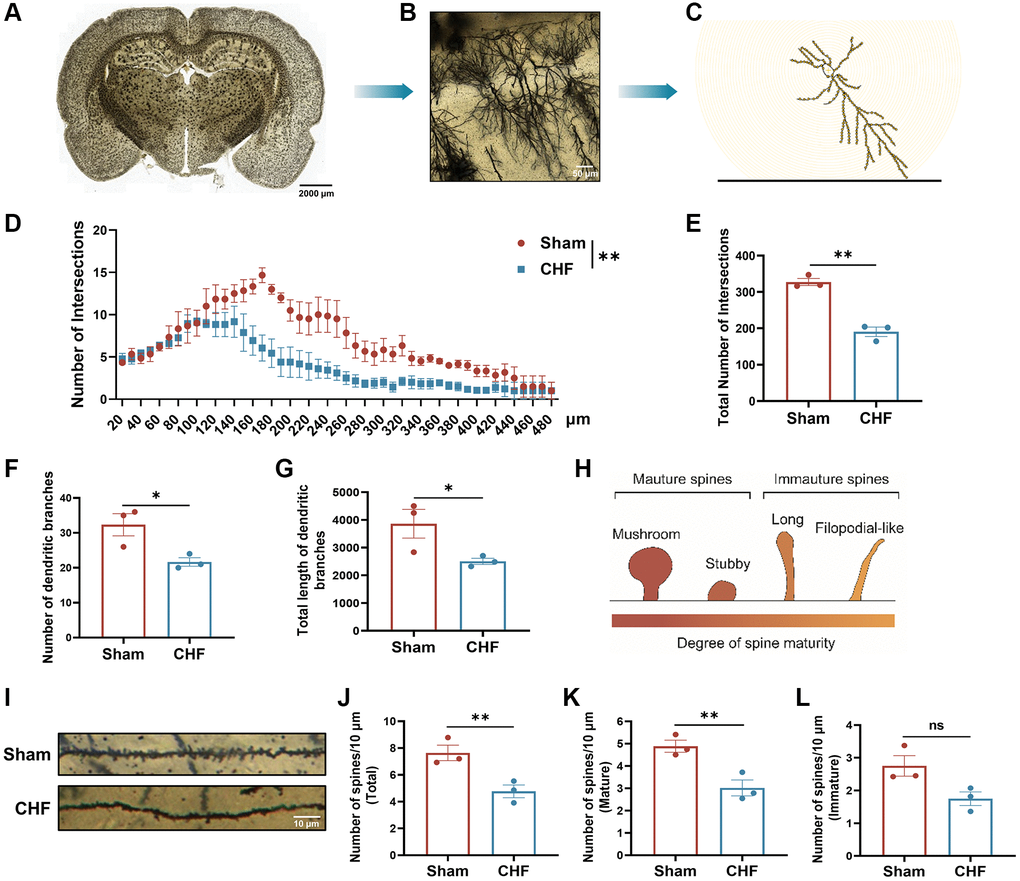 The dynamic nature of dendritic spines is integral to structural synaptic plasticity, which is essential for cognition and memory [43]. The study analyzed various dendritic features, including the total number of intersections, the count of dendritic branches, and the total length of dendritic branches in the hippocampus so as to ascertain the impact of CHF on dendritic growth. Golgi staining was utilized to fill the dendritic shafts and spines of neurons (Figure 6A–6C). Sholl analysis indicated that CHF had a negative impact on the total number of intersections compared to the Sham group (Figure 6D, 6E). In relation to the total number of dendritic branches, CHF significantly decreased the number of dendritic branches when compared to the Sham group (Figure 6F). A noticeable decline in total dendritic length was also observed after CHF (Figure 6G).