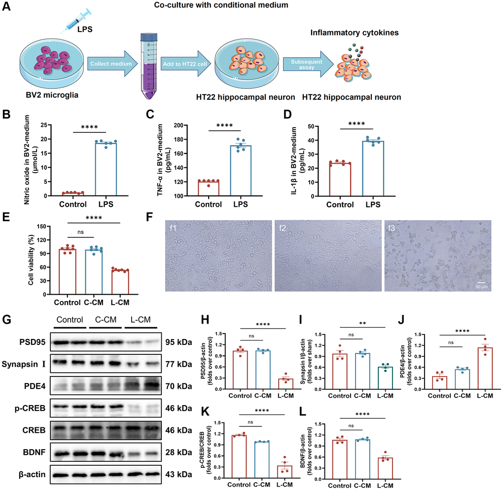 To investigate the impact of neuroinflammation on neuronal growth and synaptic plasticity, a co-culture system consisting of BV2 microglia and HT22 hippocampal neurons was established to replicate the inflammatory microenvironment within the brain (Figure 7A). We precisely detected the levels of NO, TNF-α, and IL-1β in the culture medium of BV2 cells subsequent to LPS stimulation. As compared to the Sham group, the levels of NO, TNF-α, and IL-1β were found to be elevated (Figure 7B–7D). LPS-stimulated BV2 cells had an obvious adverse effect on the viability of HT22 cells (Figure 7E). The morphology of HT22 cells cultured in LPS-stimulated BV2 cell medium became out-of-shape, shrunken, fragmented, and even dead (Figure 7F). Furthermore, we determined the levels of Synapsin I, PSD95, and BDNF by Western blot. The treatment with LPS-stimulated BV2 medium led to decreased levels of Synapsin I, PSD95, and BDNF in HT22 cells (Figure 7G–7I, 7L). Furthermore, LPS-stimulated BV2 medium upregulated PDE4 and downregulated p-CREB, and there was no change in CREB protein (Figure 7G, 7J, 7K). Taken together, these results indicate that a neuroinflammatory microenvironment impairs neuronal growth and synapse proteins in vitro and is closely associated with the alteration of PDE4/cAMP/CREB/BDNF signaling.