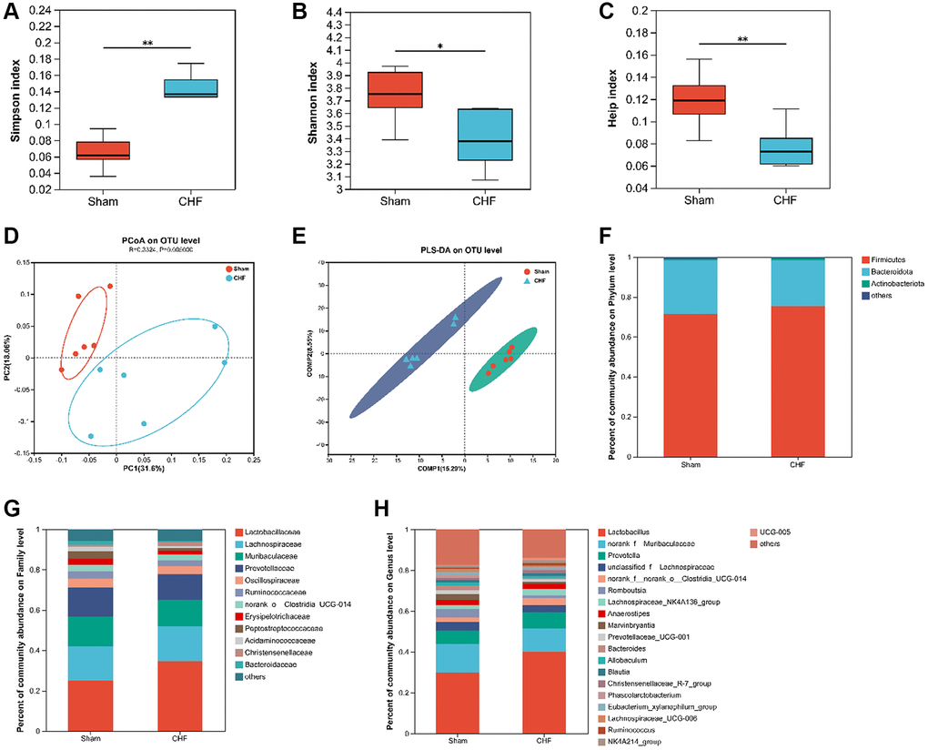 Based on the limited evidence of organ crosstalk between gut microbiota and cardiocerebral disorders in CHF, we tried to detect modifications in gut microbiota to find clues to this crosstalk between heart and brain. 16S rRNA sequencing was used to analyze the intestinal flora of CHF rats. Alpha diversity reflects the diversity and richness of microbes. CHF decreased α-diversity based on Simpson, Shannon, and Heip indices (Figure 8A–8C), indicating that the gut microbiota diversity and richness of rats significantly declined after CHF. PCoA was used to visualize the divergence between the two groups in the community structure and diversity of intestinal flora to determine the potential effects of CHF. The majority of the Sham plots were grouped to the left, while the CHF plots were dispersed and not grouped in any particular location (Figure 8D). Clearly, CHF was grouped in a separate area from Sham (Figure 8E). Overall, the findings suggest a robust association between CHF and alterations in the composition of the intestinal flora. Specifically, at the phylum level, Firmicutes and Bacteroidetes, as well as Actinobacteriota were identified as the predominant phyla in the intestinal flora. There was no significant difference in the abundance of these three phyla between the Sham and CHF groups (Figure 8F). At the family level, the five primary families present in the intestinal flora were identified as Lactobacillaceae, Lachnospiraceae, Muribaculaceae, Prevotellaceae, and Oscillospiraceae (Figure 8G). The five major intestinal flora at the genus level were Lactobacillus, norank_f_Muribaculaceae, Prevotella, unclassified_f_Lachnospiraceae, and norank_f_norank_o_Clostridia_UCG-014 (Figure 8H).