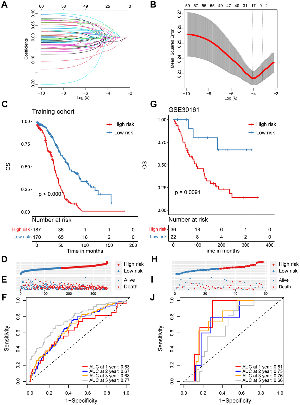 In order to investigate the prognostic role of CD8+ T cells in ovarian cancer, we firstly carried out a univariate Cox regression analysis to identify potential prognostic markers associated with CD8+ T cells for ovarian cancer in the TCGA cohort. A total of 64 genes was found to be correlated with the ovarian cancer prognosis (Supplementary Table 2). Subsequently, we performed the LASSO regression analysis to reduce the number of prognostic genes and finally identified 17 prognostic signature genes, including SLFN5, CD40LG, EMB, ISG20, CD226, CCR7, S1PR4, RNF167, MLLT3, PLEKHF1, RNPEPL1, STK39, FXYD5, BTN3A3, WNK1 and SUSD3 (Figure 2A, 2B). Based on the coefficients and expression levels of these prognostic signature genes, we computed the risk score for each sample in the TCGA ovarian cancer cohort, which served as our training set. Subsequently, we categorized the ovarian cancer patients in the TCGA training cohort into high-risk and low-risk groups using the median risk score as the threshold. Our analysis revealed that patients in the high-risk group exhibited markedly inferior outcomes (Figure 2C–2E). To assess the effectiveness of our CD8+ T cell-associated risk model, we presented receiver operator characteristic (ROC) curves and determined the area under the ROC curve (AUC) values at 1, 2, 3, and 5 years, which were 0.63, 0.67, 0.68, and 0.77, respectively (Figure 2F).