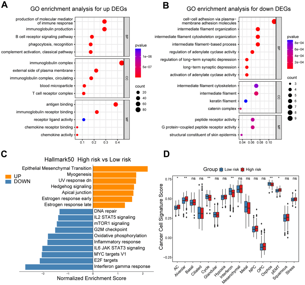 In our quest to elucidate the underlying mechanisms explaining the prognostic significance of the CD8+ T cell-related risk score, we initially set out to explore its functional and genomic attributes. GO enrichment analysis revealed that the high-risk group patients showed significant enrichment in multiple immune-related pathways, such as the B cell receptor signaling pathway, T cell receptor complex and antigen binding pathways (Figure 3A). In contrast, the intermediate filament cytoskeleton organization, catenin complex and G protein-coupled peptide receptor activity pathways were found to be enriched in the low-risk group patients (Figure 3B). In addition, the results of GSEA indicated that patients in the high-risk group had higher enrichment scores in pathways associated with epithelial-mesenchymal transition (EMT), Hedgehog signaling, and estrogen response (Figure 3C and Supplementary Figure 3A–3C), while those in the low-risk group showed elevated enrichment scores in pathways related to interferon-gamma response, DNA repair, and MYC targets V1 (Figure 3C and Supplementary Figure 3D–3F). In order to obtain further insights into the transcriptional heterogeneity among ovarian cancers, we conducted the GSVA algorithm to calculate 16 recurrent cancer cell states, which interacting with the TME to take shape organized systems qualified to promote immune escape, metastasis and drug resistance [18, 21]. We found the high-risk group patients harbored higher signature scores of astrocyte (AC)-like, alveolar and partial epithelial-mesenchymal transition (pEMT) modules (Figure 3D). Nevertheless, the cell cycle, interferon and oxidative phosphorylation modules were enriched among low-risk group ovarian cancer patients (Figure 3D).
