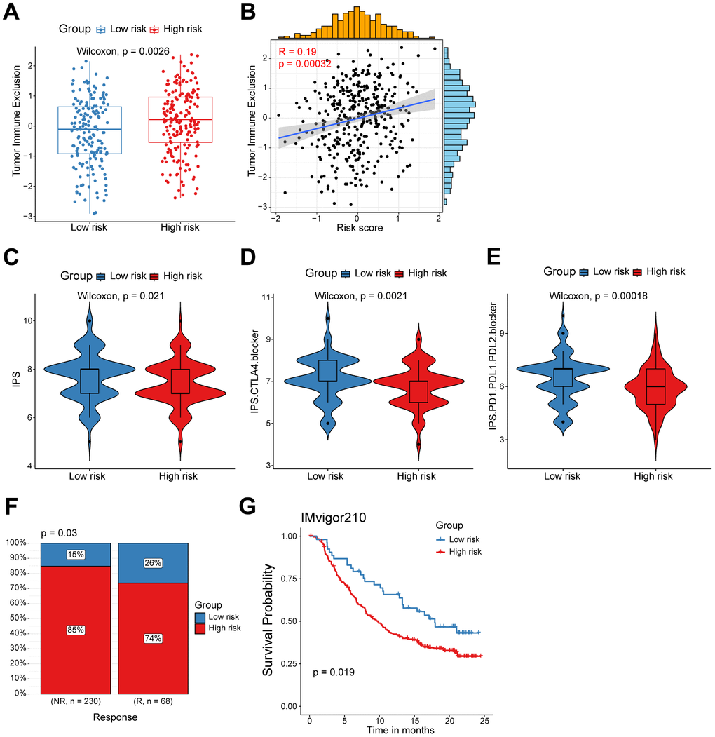 Considering the evident correlation between the CD8+ T cell-associated risk score and diverse immune checkpoints, we subsequently devoted to figuring out whether the risk score correlated with the tumor immune exclusion score, which was recognized as one of immunotherapy predictors [22]. As expected, we found that ovarian cancer patients in the high-risk group harbored a higher tumor immune exclusion score, which positively associated with the risk score (Figure 5A, 5B). To evaluate the response of ovarian cancers in different risk groups to immune checkpoint inhibitors (ICIs), we calculated the IPS score (including CTLA4 blocker and PD-1/PD-L1/PD-L2 blocker) was much significantly higher in the low-risk group patients (Figure 5C–5E). This suggested that ICIs targeting CTLA4 or PD-1/PD-L1/PD-L2 are more suitable for low-risk patients rather than the high-risk group patients. Finally, to further validate the value of our CD8+ T cell-related prognostic model in predicting the immunotherapy response, we analyzed RNA-seq data of pretreatment samples of 298 bladder cancer patients from the IMvigor210 cohort before anti-PD-L1 treatment. We found high-risk patients were mainly in the non-response group, and patients with higher risk score also exhibited inferior outcomes as showed in the Kaplan-Meier analysis (Figure 5F, 5G). Collectively, the above findings indicate that patients in the low risk-group are more likely to benefit from immunotherapy, and the CD8+ T cell-related risk score could act as a potential biomarker to distinguish ovarian cancer patients who may benefit from immunotherapy.