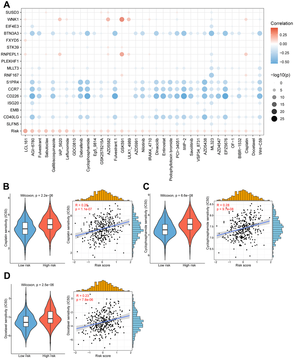The substantial implication of tumor heterogeneity lies in the fact that distinct groups of patients exhibit varying responses to anti-cancer drug treatments, thereby exacerbating the risk of treatment failure and recurrence. Therefore, we determined to explore the potential relationship between our prognostic model and diverse anti-cancer drug sensitivity. The IC50 values of multiple drugs in ovarian cancer patients were calculated and compared between the two risk groups as shown in the bubble plot (Figure 6A). Interestingly, the results suggested that the IC50 values of cisplatin, cyclophosphamide and docetaxel were significantly higher in the high-risk patients, and positively associated with the CD8+ T cell-related risk score (Figure 6B–6D). It indicated that ovarian cancer patients in the high-risk group might be more resistant to standard chemotherapy regimens. Additionally, we also assessed the correlation between the model genes and these anti-cancer drugs. Specifically, the expression levels of WNK1 and RNPEPL1 were both conspicuously positively related to the IC50 of GSK591. On the other hand, the IC50 values of cyclophosphamide negatively correlated with the expression levels of BTN3A3, S1PR4, CCR7, CD226 and CD40LG (Figure 6A). Summarily, our findings suggest that this novel CD8+ T cell-related prognostic model can be a reliable predictor for screening efficient drugs in ovarian cancers.