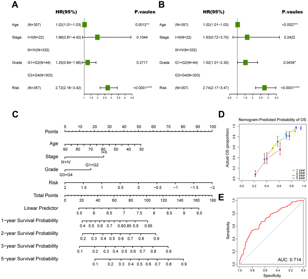 We performed univariate Cox regression analysis to investigate the correlation between gene expression and OS in patients with ovarian cancer. In the same group, we utilized multivariate Cox regression to identify independent risk factors. Genes and factors that displayed a FDR < 0.05 were deemed statistically significant in terms of patient survival. The outcomes of both univariate and multivariate Cox regression analyses were obtained and visually represented using the R package forestplot.