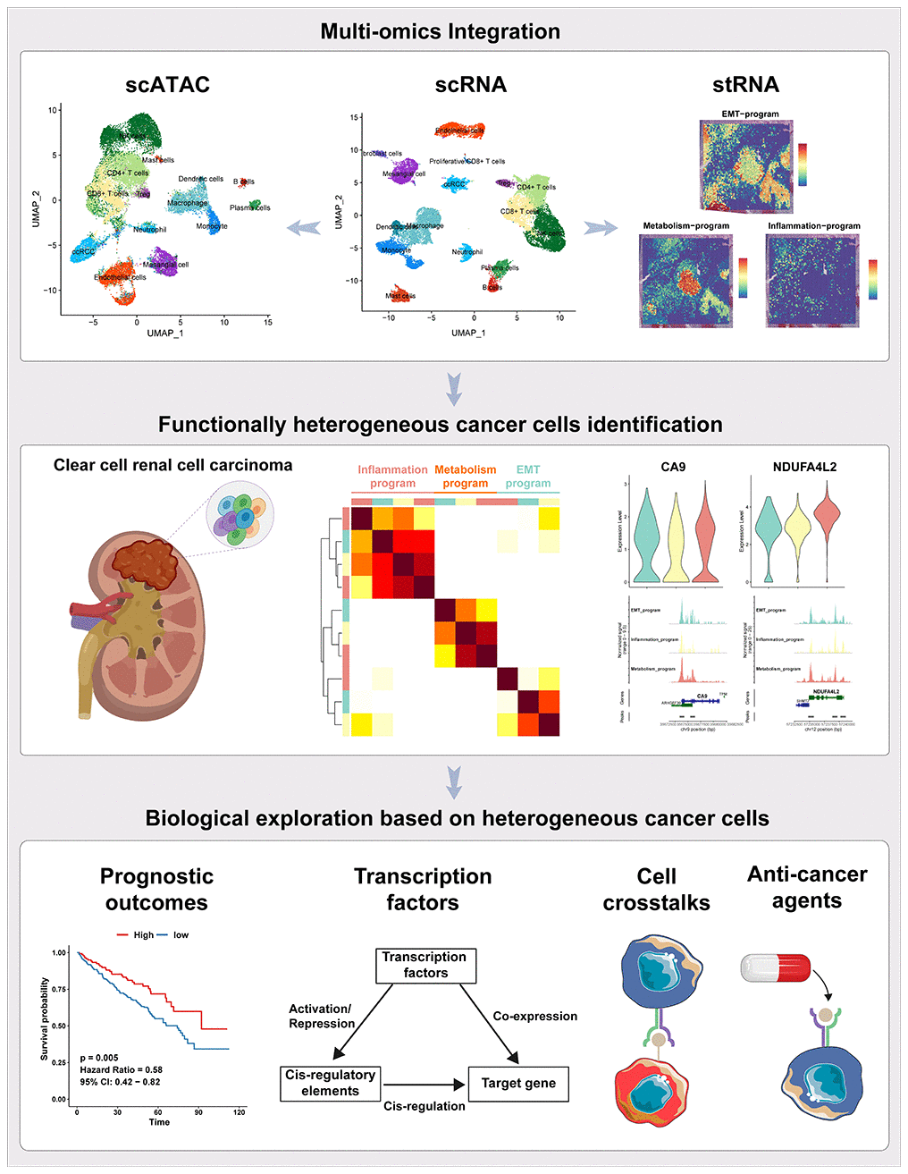 We investigated the transcriptomic and epigenomic features of functionally heterogeneous ccRCC cells in the TME by integrating single-cell RNA sequencing (scRNA-seq) and transposase-accessible chromatin sequencing (scATAC-seq) data. Spatial transcriptomics sequencing (stRNA-seq) data was used to obtain spatial information of functionally heterogeneous cancer cells. Our study provides novel approaches for integrating single-cell multi-omics and spatial omics to elucidate on the basic mechanisms of intra-tumor heterogeneity and its associated regulatory networks. Our findings inform on identification of novel therapeutic targets, and crafting of a framework for making personalized treatment decisions for ccRCC patients.