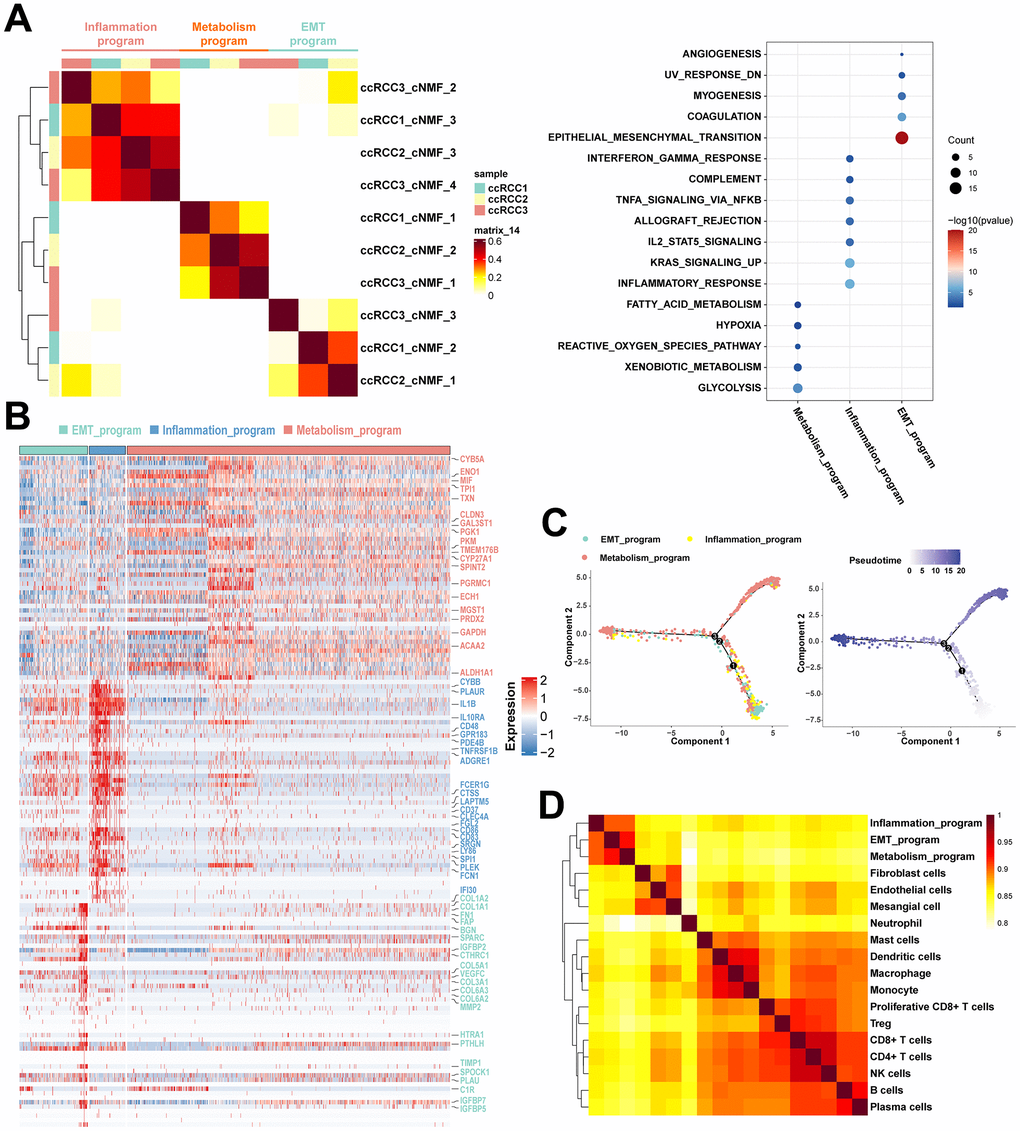To resolve the heterogeneity of ccRCC cells in multi-omics, we analyzed the cancer cells in the TME. The NMF algorithm is advantageous in interpreting tumor heterogeneity, marginally influenced by batch effects, thereby obtaining factors with biological interpretability via non-negative matrix factorization. The cNMF algorithm implemented in python [25] showed that cancer cells from the three ccRCC cases could be classified into ten programs (Supplementary Figure 2A, 2B). Based on similarities between programs, three meta programs covered by all ccRCC cases were identified (Figure 3A), which reflected the complicated phenotypes of functionally heterogeneous cancer cells in ccRCC TME. There were significant variations in transcriptomic profiles of such meta programs, all of which were functionally defined as inflammatory meta program, metabolism meta program, and EMT meta program based on pathway enrichment analysis of their specific characteristic gene expression signatures (Figure 3A, 3B and Supplementary Tables 2, 3). The inflammatory meta programs were mainly enriched in inflammatory responses, complement, interferon gamma responses, and IL2 STAT5 signaling pathway. The EMT meta program was significantly enriched in epithelial mesenchymal transition, coagulation, myogenesis, and angiogenesis, while metabolism meta program was highly enriched in hypoxia, xenobiotic metabolism, glycolysis, fatty acid metabolism, and reactive oxygen species pathway. The metabolism meta program accounted for the largest proportion of cancer cells, implying that ccRCC is a hypermetabolic disease, as evidenced by abnormal accumulation of lipid droplets in cancer tissues and cell lines, and its close association with lipid metabolism pathways [24, 26]. Annotation of cancer cell clusters in scRNA data with corresponding clusters in scATAC data revealed that the three meta programs manifested elevated expression and chromatin opening (Supplementary Figure 3A) of cancer-specific markers (CA9 and NDUFA4L2). There was a loss of chromosome 3p and amplification of chromosome 5q in all three meta programs (Supplementary Figure 3B). Pseudotime analysis showed that cancer cells in EMT meta programs were at the beginning of the differentiation trajectory, while cancer cells of the metabolism meta program were predominant at the trajectory terminus, representing the specific physiological states of the functionally heterogeneous cancer cells in the TME. Thus, EMT is a crucial process in cancer developments (Figure 3C).