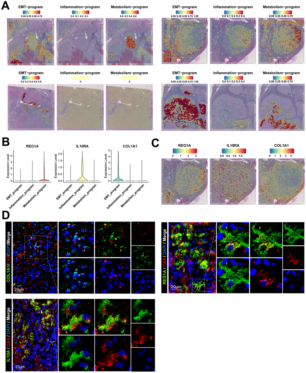 Transcriptional characterization of signature genes in the three meta programs was performed and validated using the scATAC-seq and stRNA-seq data (Figure 4B, 4C and Supplementary Figure 4A–4D), with results disclosing that the metabolism meta program specifically expressed REG1A, a molecular marker for ccRCC [27]. The inflammatory meta program exhibited high expression of IL10RA, which is closely associated with interferon receptors and mediates immunosuppressive signaling of IL10, thereby inhibiting pro-inflammatory cytokine secretion [28]. The EMT meta program characteristically expressed COL1A1, which is preferentially expressed in fibroblasts. Transcriptional profiles of the EMT process suggests that such cancer cells may have fibroblast-like phenotypes and an ability to secrete fibronectin [29]. The three characteristic genes are barely expressed in major cell types of normal kidney tissues (Supplementary Figure 4E–4G). We validated the staining of signature genes of such three meta programs using tumor samples collected in clinical settings (Figure 4D). The signature genes were co-localized with the ccRCC-specific marker (CA9) in cancer tissues [30], revealing the existence of such three types of functionally heterogeneous cancer cells in the TME of ccRCC cases.