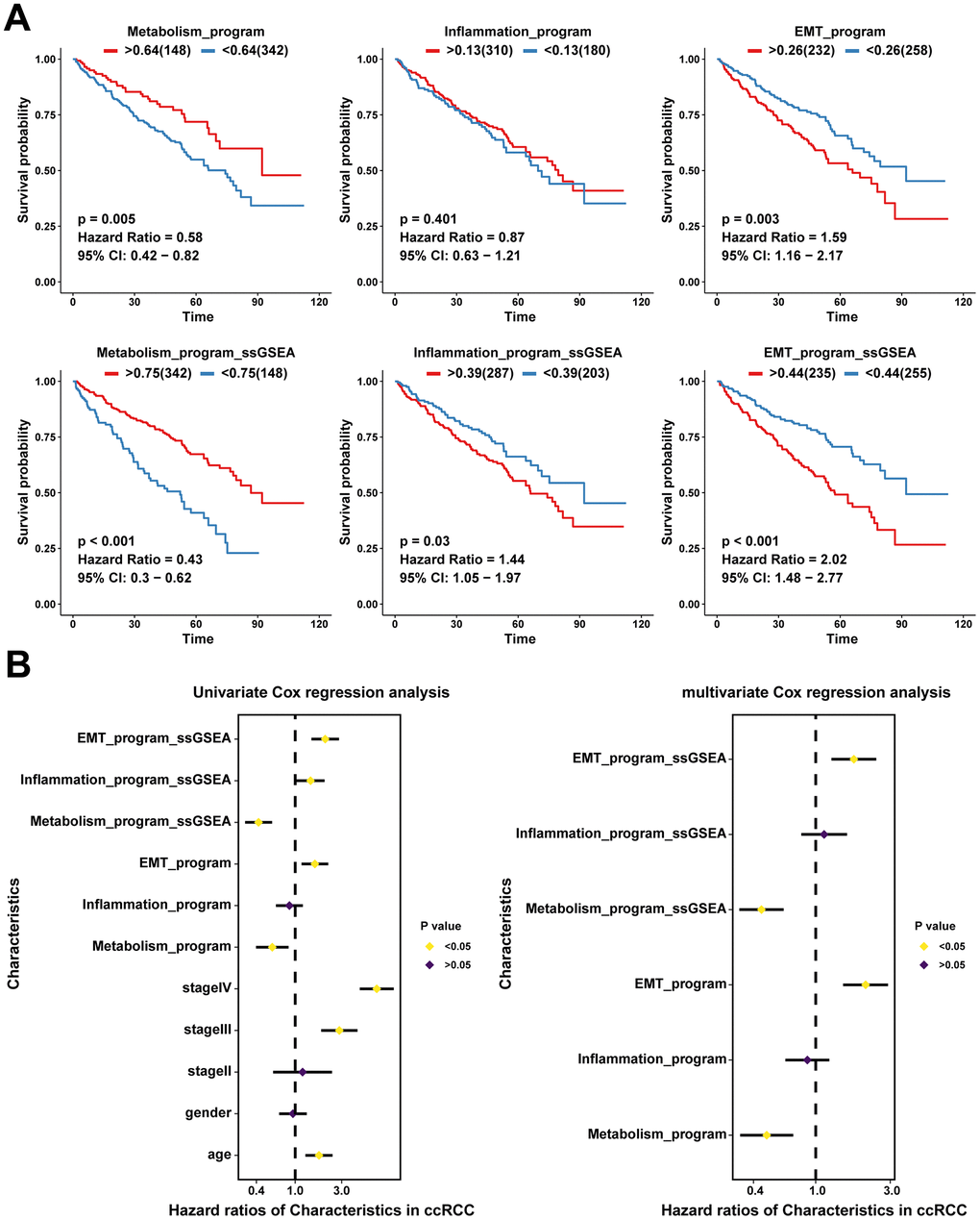 We further performed univariate and multivariate Cox analyses for the effects of cancer cell infiltration abundance, ssGSEA scores of characteristic genes, and clinical indicators (age, gender, and stage) on prognostic outcomes. Univariate Cox analysis revealed identical trends as those obtained from the Kaplan-Meier survival analysis (Figure 5B). After excluding the effects of confounding factors, such as age, gender, and stage, we performed multivariate Cox analysis on ssGSEA scores and infiltration abundance of cancer cells of different meta programs, which showed that infiltration abundance as well as ssGSEA scores of meta metabolism and EMT meta programs were independent prognostic factors; the EMT meta program played an adverse role, while the metabolism program played a protective role in survival outcomes of ccRCC (Figure 5B). The ssGSEA scores were significantly correlated with infiltration abundance of cancer cells in different meta programs, indicating that ssGSEA scores can reflect, to some extent, the infiltration levels of functionally heterogeneous cancer cells (Supplementary Figure 5B).