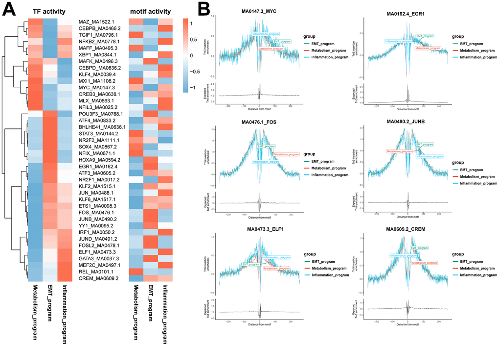 Program-specific transcription factors were identified by combining scRNA and scATAC data. First, we investigated the transcription factor regulatory network of functionally heterogeneous cancer cells in different meta programs based on scRNA-seq data using pySCENIC. Transcription factor motif activities were inferred using chromVAR packages based on scATAC-seq data, whereby chromatin accessibility of transcription factor binding sites were characterized at the DNA level. Program-specific transcription factors were identified using both pySCENIC and motif activity analysis combined with transcription factor footprint analysis (Figure 6A, 6B). In the metabolism meta program, we identified transcription factor MYC, with results of co-expressed downstream target genes of transcription factors showing that it was closely associated with the hypoxia-related signaling pathway. In the EMT meta program, we identified transcription factors EGR1, FOS and JUNB, with downstream target genes being associated with epithelial mesenchymal transition, myogenesis, and the angiogenesis signaling pathway. Moreover, transcription factors ELF1 and CREM were found in the inflammatory meta program, with downstream target genes being predominantly enriched in inflammatory responses, complement, interferon gamma responses, and IL2 STAT5 signaling pathways (Figure 6A, 6B and Supplementary Figure 5C).