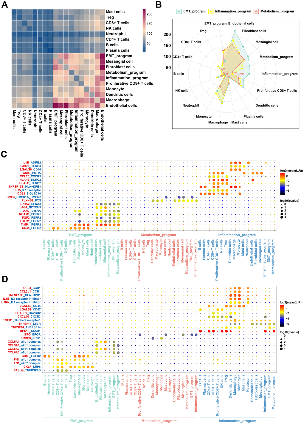 To establish the crosstalks among various cellular identities in the TME, we investigated ligand-receptor pair expression in different cell clusters using CellphoneDB. We specifically focused on interactions between functionally heterogeneous cancer cells of different meta programs and other cell subpopulations in the microenvironment. Cancer cells of the EMT meta program exhibited abundant ligand receptor pairs with endothelial cells, fibroblasts, proliferative CD8+ T cells, dendritic cells and mesangial cells (Figure 7A), and there were more interactions with such cell types when compared with other meta programs (Figure 7B). This shows the close intercellular crosstalk between cancer cells of the EMT meta program with other cell identities in the TME. Both immune and mesangial cells interacted with cancer cells of the EMT program via the FGFR2 receptor of the FGF family (Figure 7C), with evidence indicating the pivotal role of FGFR2 in mediation of EMT and cancer cell angiogenesis [31]. The EMT program exhibited a unique secretory phenotype, characterized by powerful abilities of secreting collagen fibers and enriched communication with mesangial cells (Figure 7D), which were directly associated with cell migration and focal adhesion regulation. The inflammatory meta program presented highly enriched crosstalks with most immune cells, when compared with other meta programs (Figure 7B). Ligand LGALS9 with its receptors (CD44, CD47, and HAVCR2) showed that the inflammatory meta program also interacted with immune cells, implying that it is a cysteine/galactose binding protein that can compromise the functions of NK and T cell to facilitate cancer cell immune escape [32]. Ligands of IL1 receptor inhibitor with receptors of IL1RN and IL1B shared similar roles in immune escape and tumor metastasis (Figure 7D).