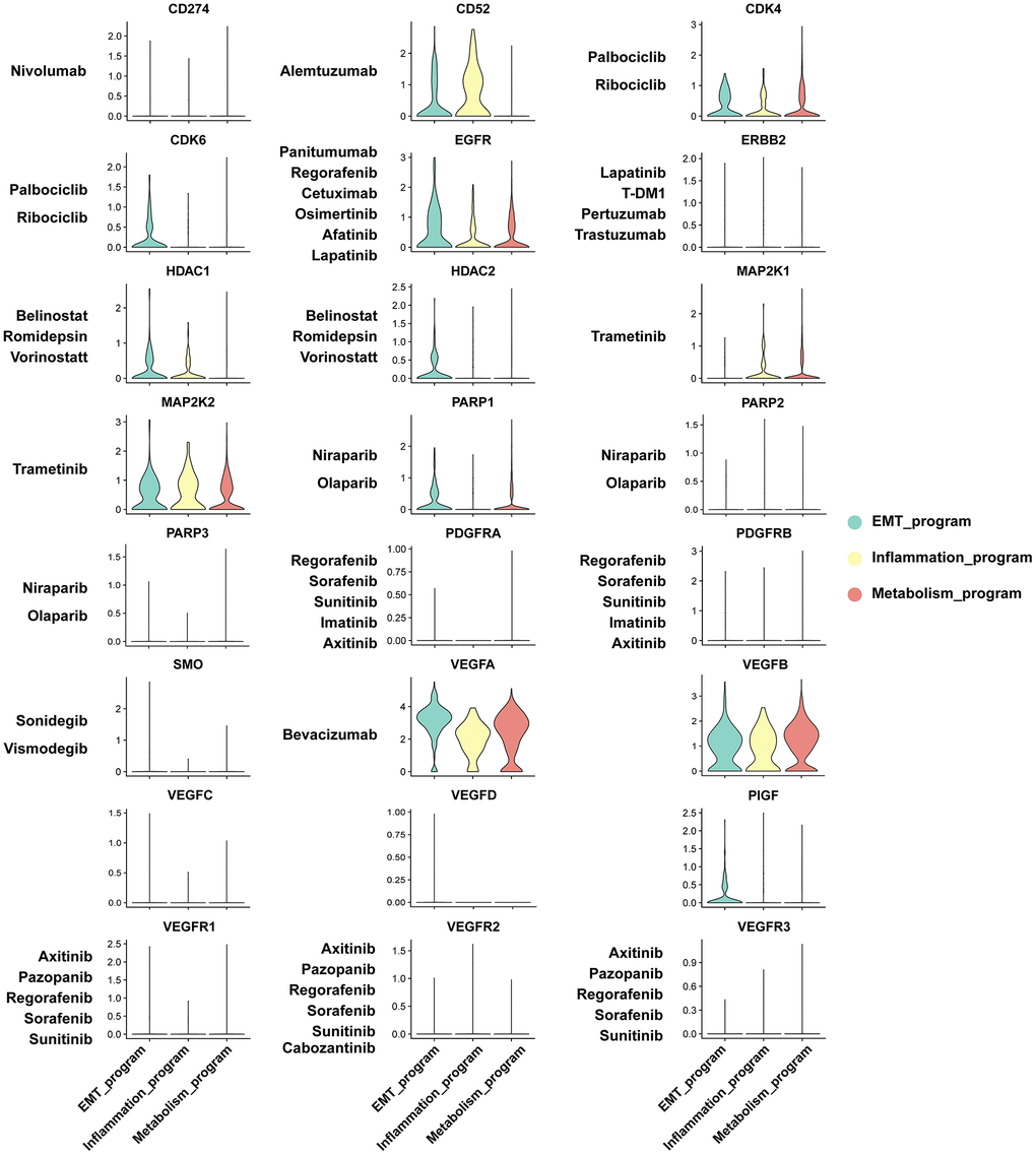 Surgical resection is the preferable treatment option for patients with localized ccRCC. Due to its insidious onset and progressive nature, most cases present terminal with inoperable advanced stages and receive systemic chemotherapies. Benefits from standard chemotherapies are poor, and a majority of the responders develop resistance, resulting in limited survival outcomes. Intra-tumor heterogeneity has a major role in tumor relapse and drug resistance [1, 6, 7, 53]. We analyzed the molecular profiles of key molecules for current targeted therapies in functionally heterogeneous ccRCC cells. We analyzed the molecular profiles of key molecules for mainstream targeted therapies in functionally heterogeneous cancer cells. We found that increased expression of VEGFA in cancer cells of the three types of programs, mediated the benefits of Bevacizumab treatment, a humanized monoclonal antibody against VEGFA, in ccRCC treatment. Particularly, VEGFB, which is a newly identified target sharing similar structures with VEGFA [54], exhibited enhanced expression level in cancer cells. Translational studies have elucidated on the therapeutic potentials of targeting VEGFB. Moreover, CDK4, EGFR, and MAP2K2 exhibited moderately high expression levels in cancer cells, with drugs targeting such therapeutic molecules presenting encouraging results in cancer therapy, but their clinical applications in kidney cancer are rarely reported [55–57]. Apart from molecular targets expressed in cancer cells of the three types of programs, CD52, CDK6, HDAC2, and PIGF were specifically expressed in inflammatory or EMT meta programs, indicating that drugs against these targets may respond in specific cancer cell subpopulations.