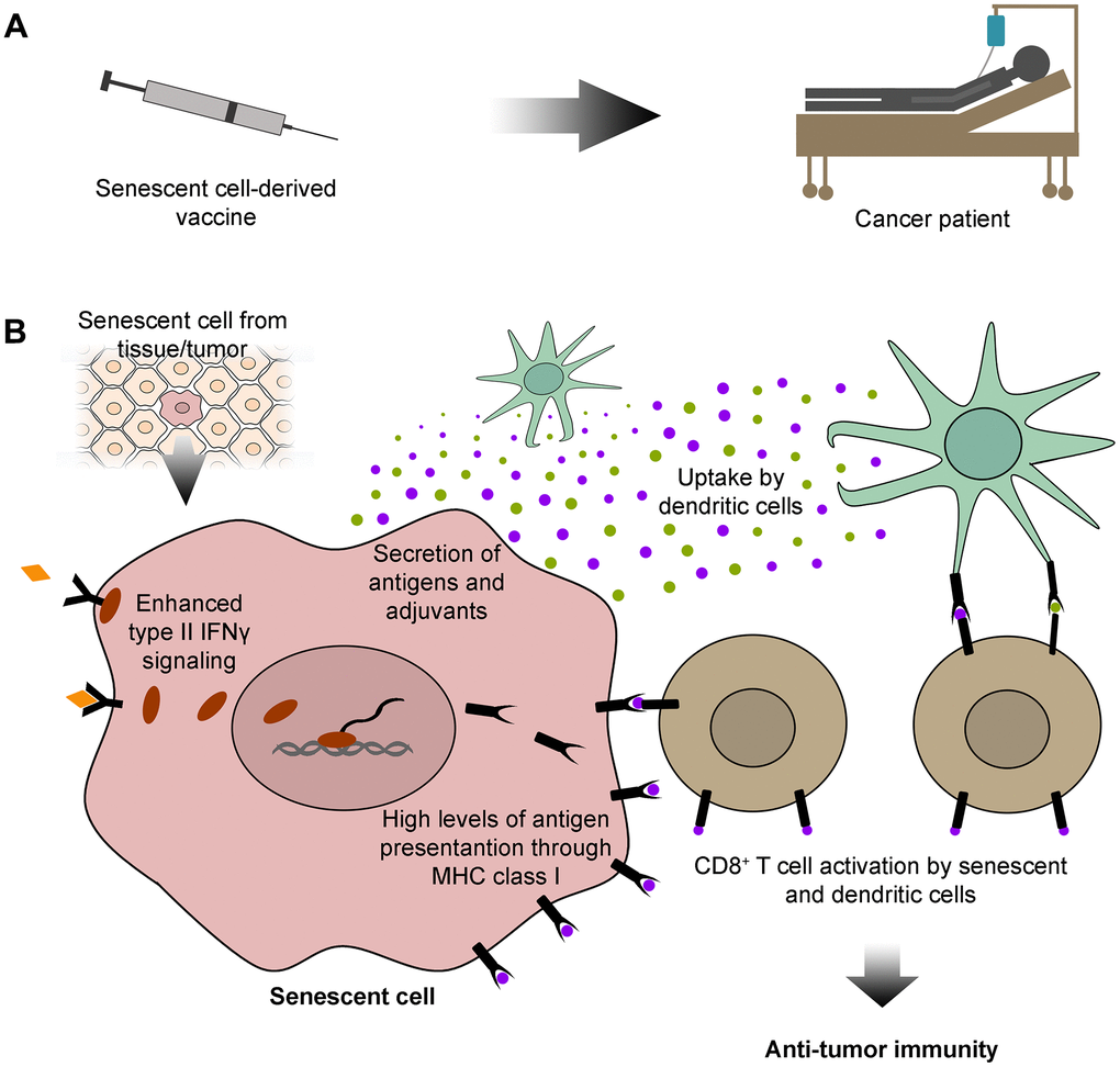 Recent evidence supports the use of TASCs as sources of peptide antigens and adjuvants for anticancer vaccine development (Figure 1A). Their SASP provides abundant release of stimulatory cytokines, which, in conjunction with high levels of antigen presentation, generates a robust tumor specific T cell response (Figure 1B). As discussed here, this approach will potentiate their adjuvanticity in cancer targeting, allowing the design of stronger and directed immunotherapeutic strategies. Moreover, since cancer and senescent cells share common antigens, this immunotherapeutic approach could also be effective against aging and age-related diseases. Therefore, cancer immunotherapy based on TASCs and other types of senescent cells may achieve exciting outcomes beyond cancer therapy.