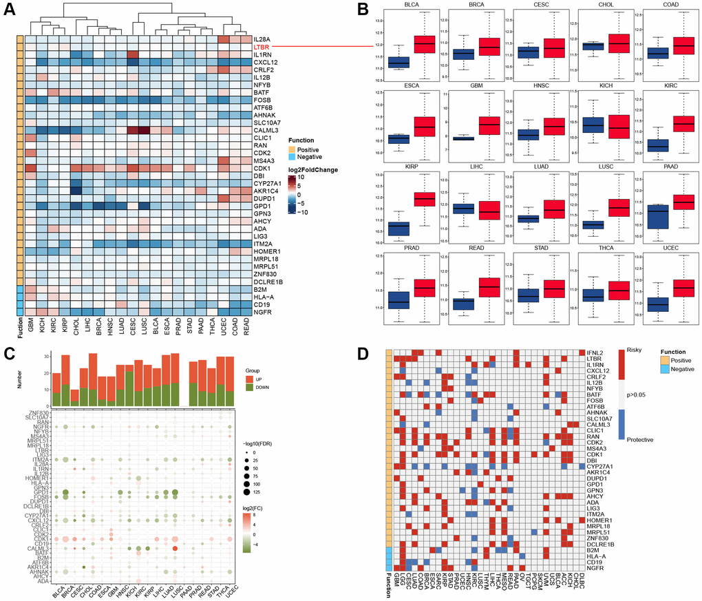 The pan-cancer expression matrix and survival data were obtained from the Xena database (https://xena.ucsc.edu). From tumors with available tumor and normal samples, we extracted the expression levels of 37 T-cell proliferation regulatory genes. Differential expression analysis on these genes was conducted using the Limma package [64]. We further demonstrated the expression of LTBR, the most powerful functional gene among 37 T cell proliferation-related genes, in each tumor. Differentially expressed genes (DEGs) were determined based on a threshold of FoldChange >1 and an adjusted P-value (FDR) less than 0.05. The impact of T-cell proliferation regulatory genes on patient prognosis was investigated using Cox analysis.