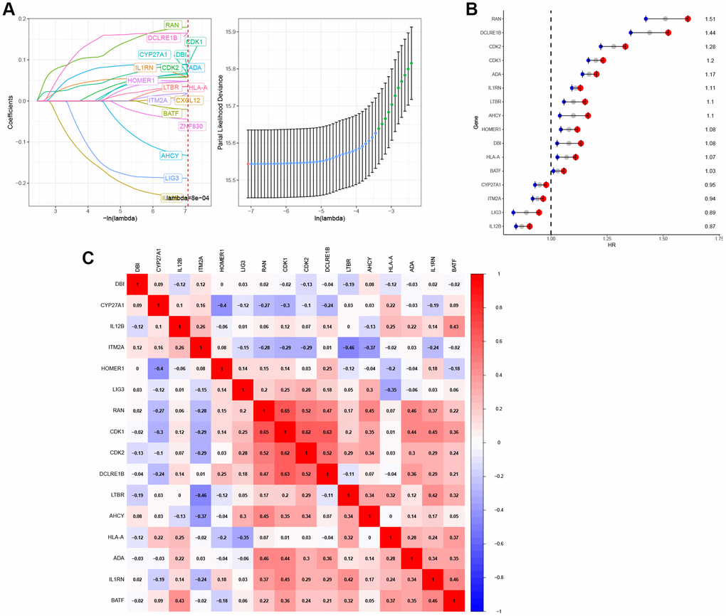 In the TCGA pan-cancer training dataset, a LASSO regression analysis was conducted using 51 initial biomarkers of T cell proliferation regulatory genes (Figure 10A). This analysis identified 16 genes with non-zero correlation coefficients. To remove genes with similar expression patterns, the remaining 16 genes were selected for further model construction. Cox regression analysis was subsequently conducted on the set of 16 genes (Figure 10B). Subsequently, correlation analysis revealed that certain genes exhibited similar expression patterns (Figure 10C).