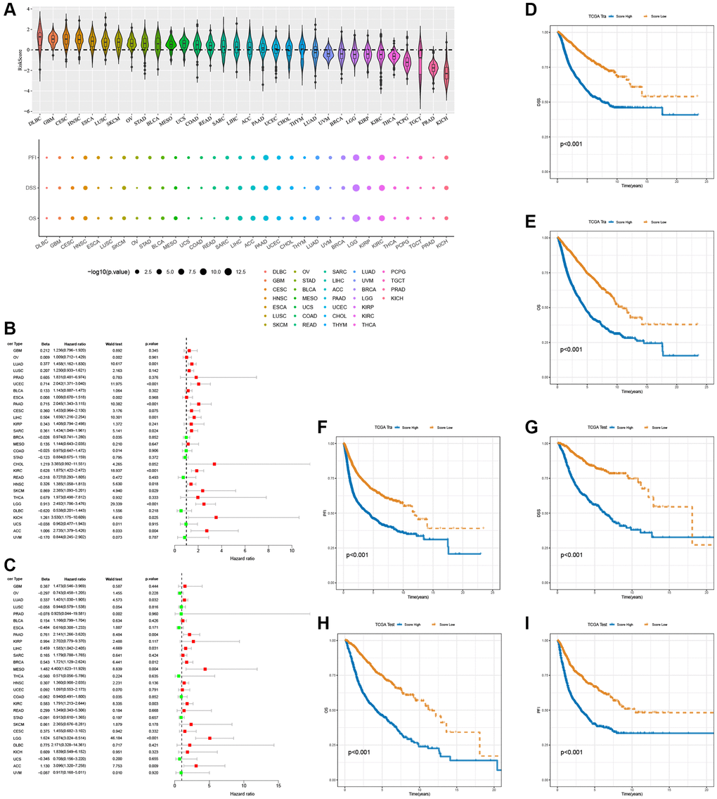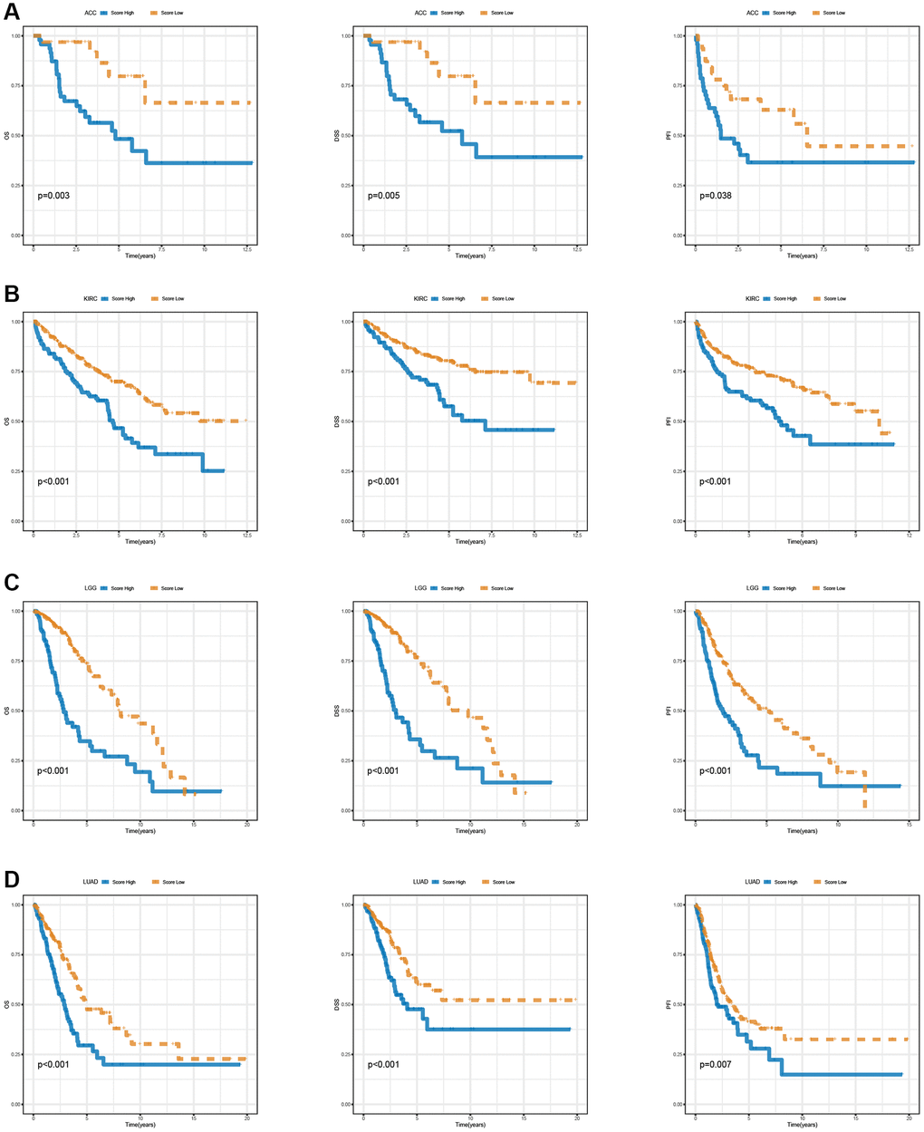 In the pan-cancer context, Figure 11A illustrates the scoring of T-cell proliferation regulatory genes. Univariate Cox regression analysis was performed on both the pan-cancer training cohort (Figure 11B) and test cohort (Figure 11C) to evaluate the influence of T-cell proliferation regulatory gene scores on different predictive and prognostic outcomes. The results demonstrate a significant association between higher T-cell proliferation regulatory gene scores and adverse prognosis across most cancer types. Based on whether the T-cell proliferation regulatory gene score exceeded the population median, patients in the TCGA training cohort were classified into high-risk or low-risk groups. Compared to the low-risk group, pan-cancer patients with higher T-cell proliferation regulatory gene scores showed correlations with various unfavorable survival indicators, including DSS (Figure 11D), OS (Figure 11E), and PFI (Figure 11F). To examine the effectiveness and universality of this signature, the predictive role of T-cell proliferation regulatory gene scores was first validated in the pan-cancer test cohort. Consistent with the results obtained from the training cohort, the survival analysis of patients in the test cohort demonstrated an association between higher T-cell proliferation regulatory gene scores and poorer prognosis (Figure 11G–11I). Furthermore, it was observed that T-cell proliferation regulatory gene scores exhibited significant correlation for the prognosis of patients with ACC (Figure 12A), KIRC (Figure 12B), LGG (Figure 12C), and LUAD (Figure 12D).