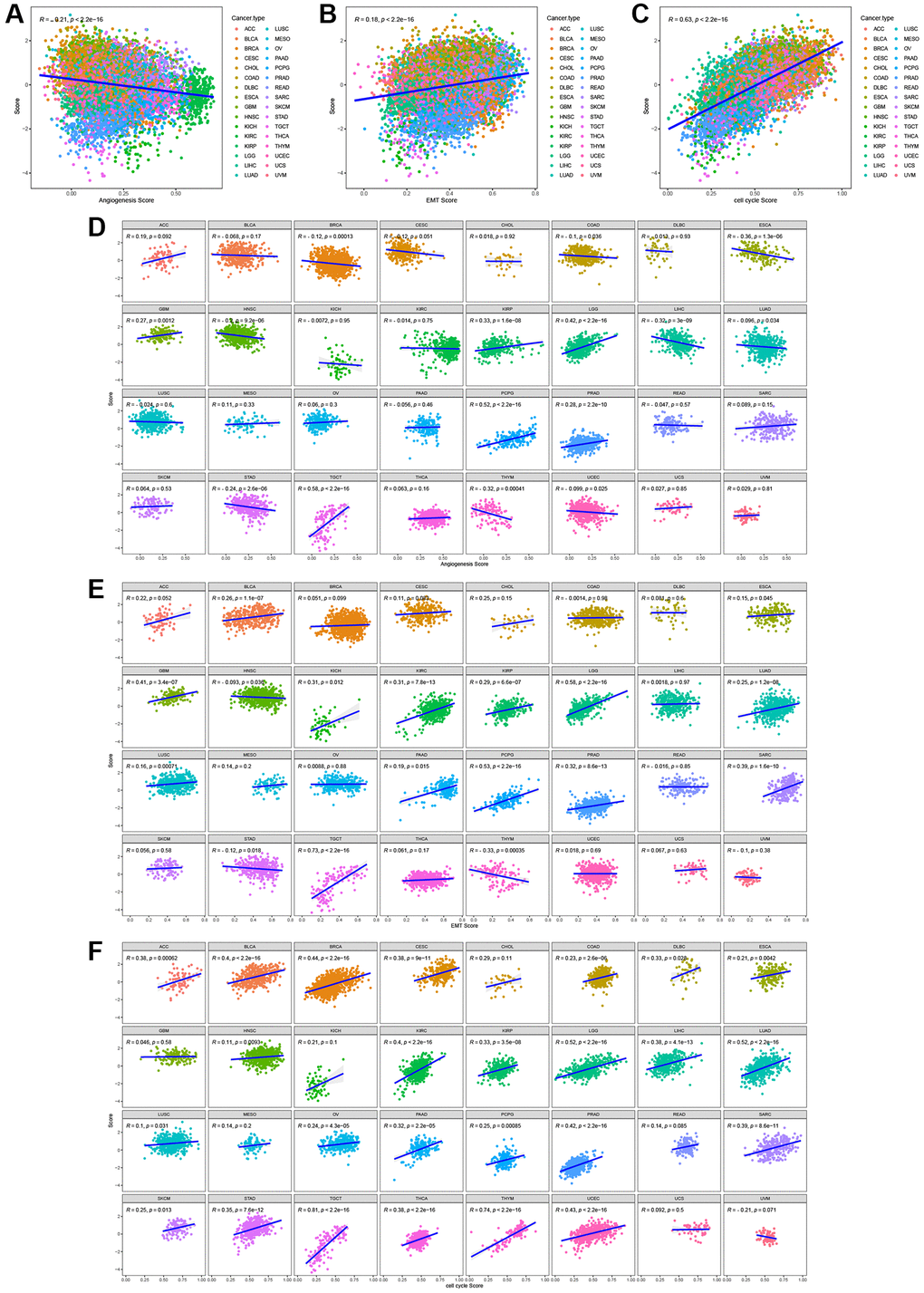 During the process of normal cell transformation into a malignant state, rapid proliferation, active epithelial-mesenchymal transition (EMT), and angiogenesis are acquired, all of which are hallmarks of cancer [23]. To examine the association between the characteristics of T-cell proliferation regulatory genes and malignant traits, we quantified the tumor’s capacities in promoting T-cell proliferation, angiogenesis, EMT, and cell cycle using the z-score algorithm. A significant correlation was observed between the z-scores of T-cell proliferation regulatory genes and both EMT and cell cycle z-scores in the entire TCGA pan-cancer cohort (Figure 13A–13C) or across most tumor types (Figure 13D–13F).