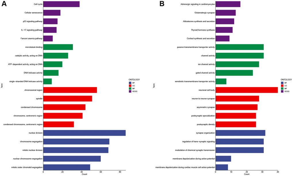 GO (Gene Ontology) and KEGG (Kyoto Encyclopedia of Genes and Genomes) analyses were conducted to explore the enriched functions of differentially expressed genes between the high-risk and low-risk groups. Up-regulated differentially expressed genes are enriched in cell cycle, cellular senescence, p53 signaling pathway, IL-17 signaling pathway, nuclear division, chromosome segregation, and mitotic karyokinesis (Figure 14A). Down-regulated differentially expressed genes were mainly enriched in Adrenergic signaling in cardiomyocytes, Glutamatergic synapse, Aldosterone synthesis and secretion, synapse organization, regulation of trans-synaptic signaling, modulation of chemical synaptic transmission (Figure 14B).