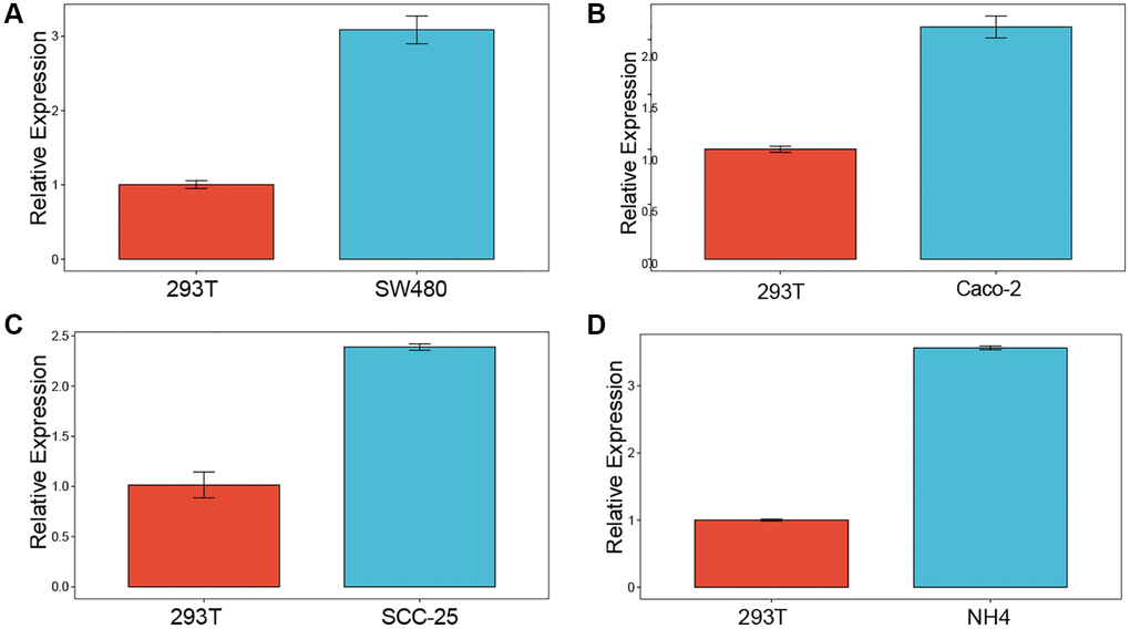 We investigated the expression of LTBR in normal cell line (293T) and cancer cell lines (SW480, Caco-2, SCC25, NH4) by employing qPCR. The results of the study showed that LTBR was expressed at a higher level in cancer cell lines compared to normal cell line (Figure 15A–15D).