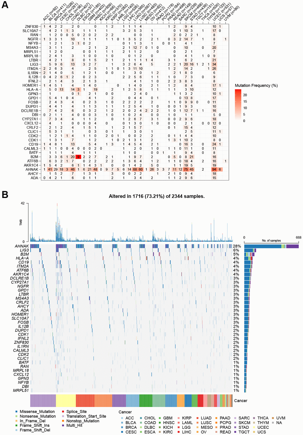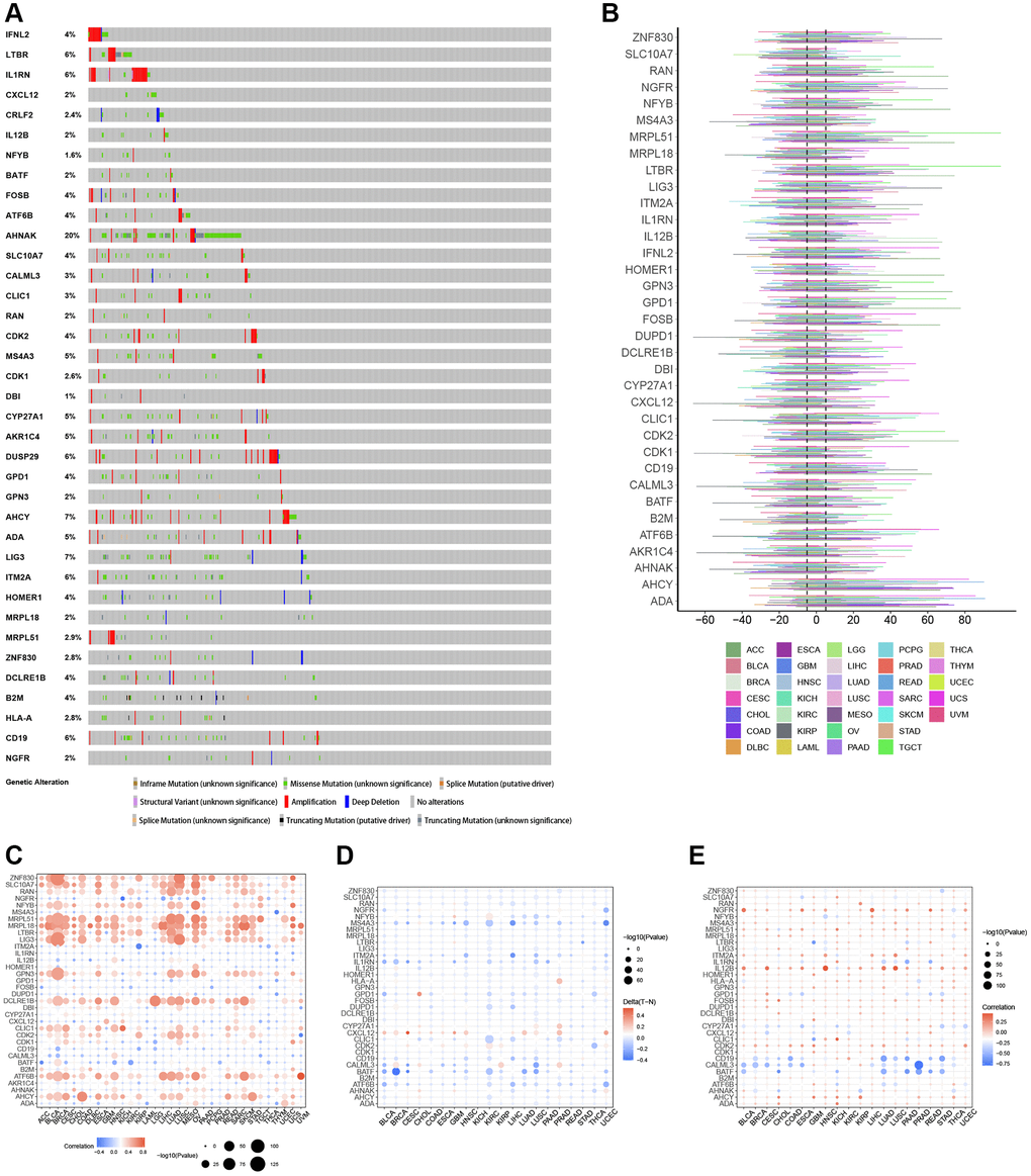 By examining SNP data, we identified the frequency and type of mutations of T-cell proliferation-associated genes in each cancer subtype. Figure 2A shows that AHNAK had the highest mutation frequency in most cancers, and the remaining T cell proliferation-related genes had lower mutation frequencies in most cancers. The SNV percentage analysis showed that the top 3 mutated genes were AHNAK, LIG3, and B2M, where the mutation percentages were 28%, 6%, and 5%, respectively (Figure 2B). Using the cBioPortal database (Figure 3A), we found that the types of genetic variants in T-cell proliferation-associated genes were mainly Amplification and Missense Mutation (unknown significance). To further investigate the genetic abnormalities of T-cell proliferation-related genes in cancer, we examined the percentage of SCNA. The results indicated that SCNA frequently occurred in most cancer types, with frequencies exceeding 5% of all samples (Figure 3B). As CNA plays a crucial role in regulating gene expression in tumors, we assessed the impact of CNA on gene expression. Pearson correlation analysis was conducted between gene expression and copy number using the masked copy number fragment from TCGA. The findings demonstrated significant correlations between the expression of most T cell proliferation-related genes and SCNA in various tumors (Figure 3C). For instance, the expression of citrate synthase (CS), involved in oxidative metabolism, displayed a significant association with CNA across all cancers. These results indicate that abnormalities in the copy number of T-cell proliferation-related genes are commonly observed in most cancers and can influence gene expression. We observed that T-cell proliferation-associated genes showed hypomethylation status in most cancer types (Figure 3D). The correlation analysis (Figure 3E) revealed a correlation between gene expression and DNA methylation.