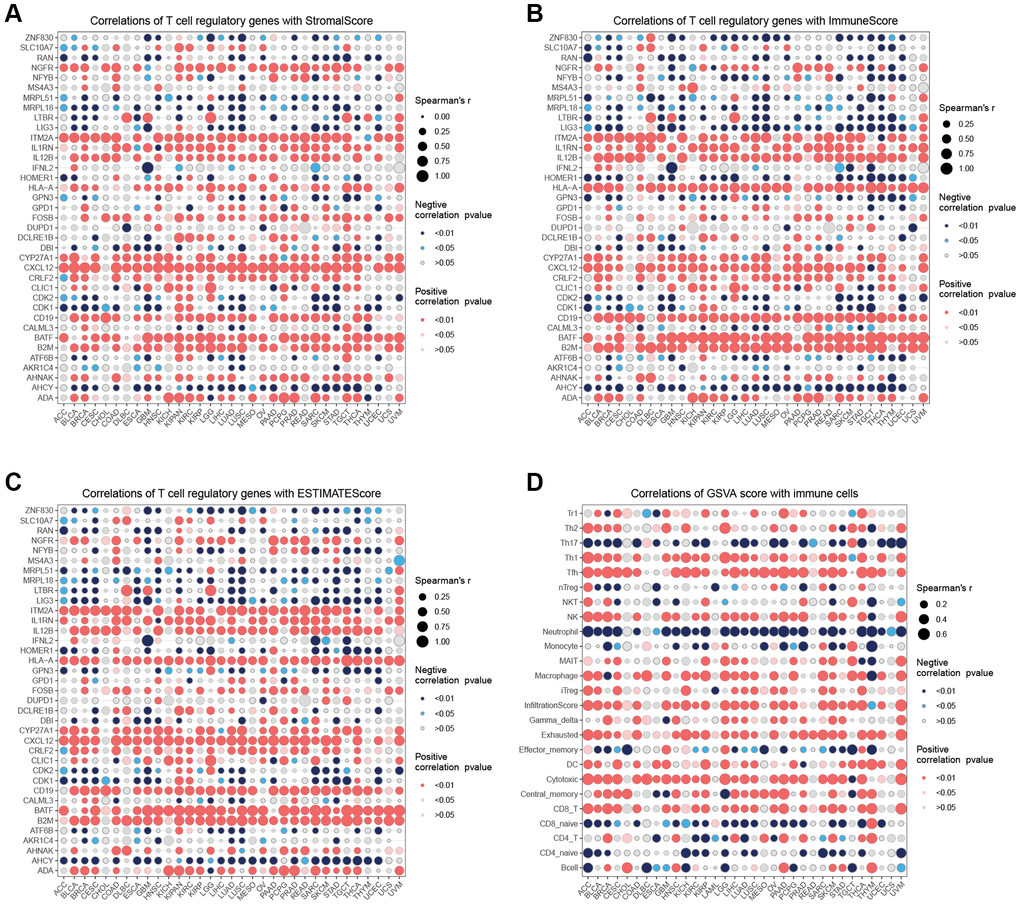 The correlation between T-cell proliferation-related gene expression and tumor mutational burden (TMB) or microsatellite instability (MSI) across various tumors in the TCGA dataset was assessed using the Spearman test. The results were visualized using the “ggplot2” R package [65]. Additionally, the ESTIMATEScore, ImmuneScore, and StromalScore were computed for each tumor using the ESTIMATE algorithm, and the correlation coefficients between T-cell proliferation-related genes and these three scores were calculated using the Spearman algorithm. Gene Set Cancer Analysis can be used for immune infiltration analysis of genes [66]. The Gene Set Variance Analysis (GSVA) score, which reflects the overall genomic expression level, is positively correlated with genome-wide gene expression. Hence, a higher GSVA score in the tumor group compared to neighboring groups indicates elevated overall genome expression within the tumor group. The GSVA scores were calculated using the R package GSVA. ImmunecellAI was employed to assess immune cell infiltration. The association between immune cell infiltration and genomic expression levels was evaluated using Spearman correlation analysis, represented by a correlation coefficient.