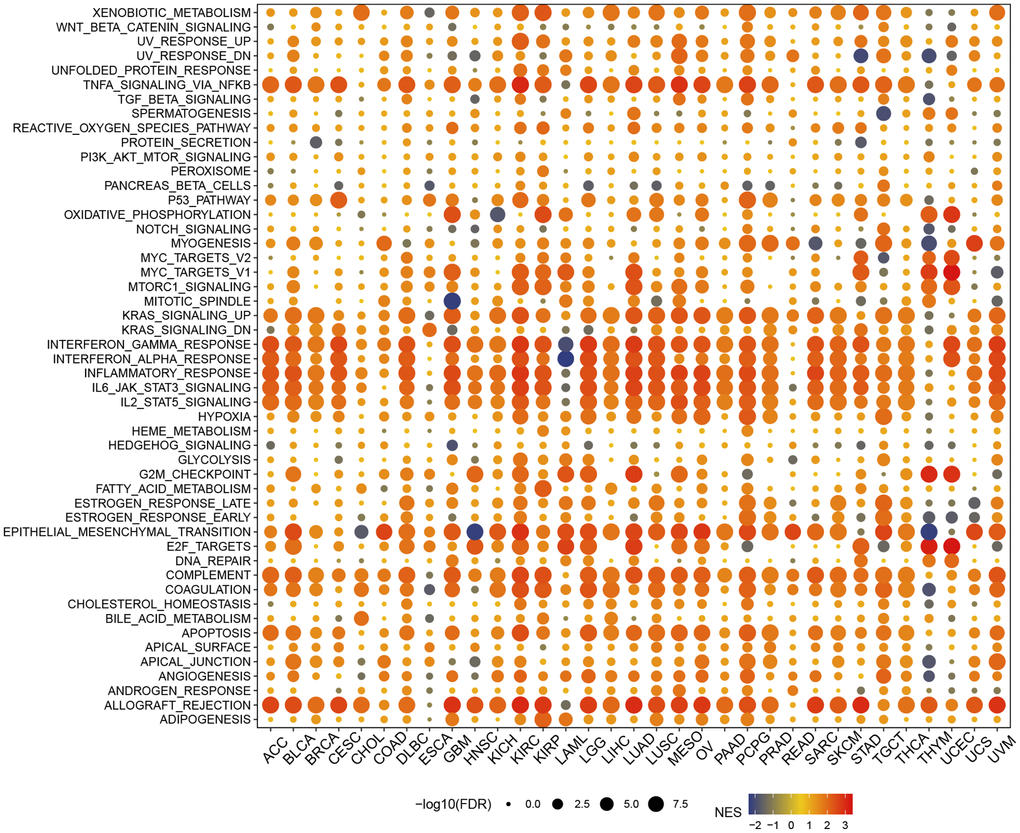 To further explore the pathways by which T cell proliferation-related genes affect tumors, we calculated the fraction of T cell proliferation-related genes using gene set variation analysis at the pan-cancer level. Subsequently, based on the median scores, samples from each tumor type were categorized into two groups. Gene set enrichment analysis (GSEA) was then conducted to examine the enrichment of T-cell proliferation-related genes in immune-related pathways.