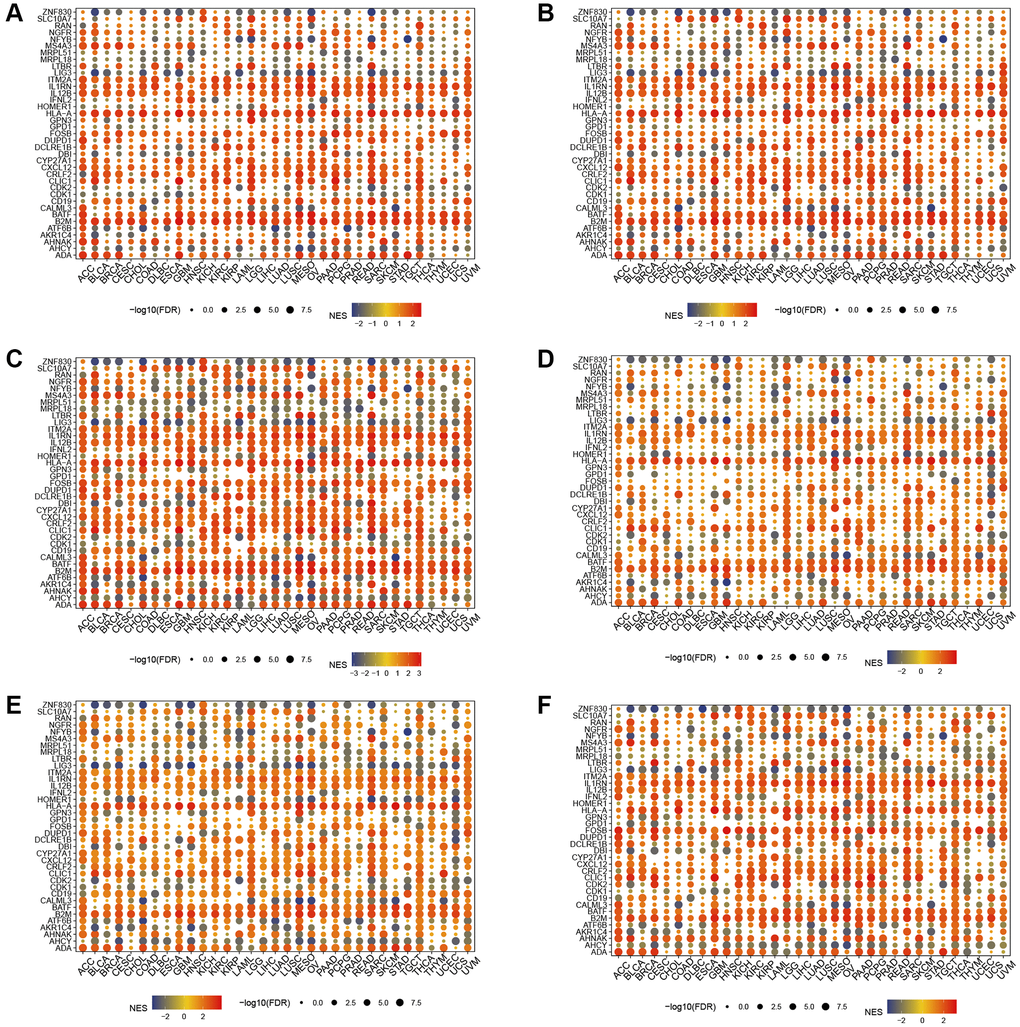 In the hallmark gene sets, T cell proliferation-associated genes were associated with immune-related pathways, like especially tnfa signaling via nfkb, kras signaling up, and interferon gamma response (Figure 6). We observed a robust positive association between immunological pathways and genes involved in T-cell proliferation. Therefore, we further showed the enrichment of each T cell proliferation-related gene in the immune-related pathways of each tumor, including il2 stat5 signaling (Figure 7A), il6 jak stat3 signaling (Figure 7B), inflammatory response (Figure 7C), interferon alpha response (Figure 7D), interferon gamma response (Figure 7E), and tnfa signaling via nfkb (Figure 7F).