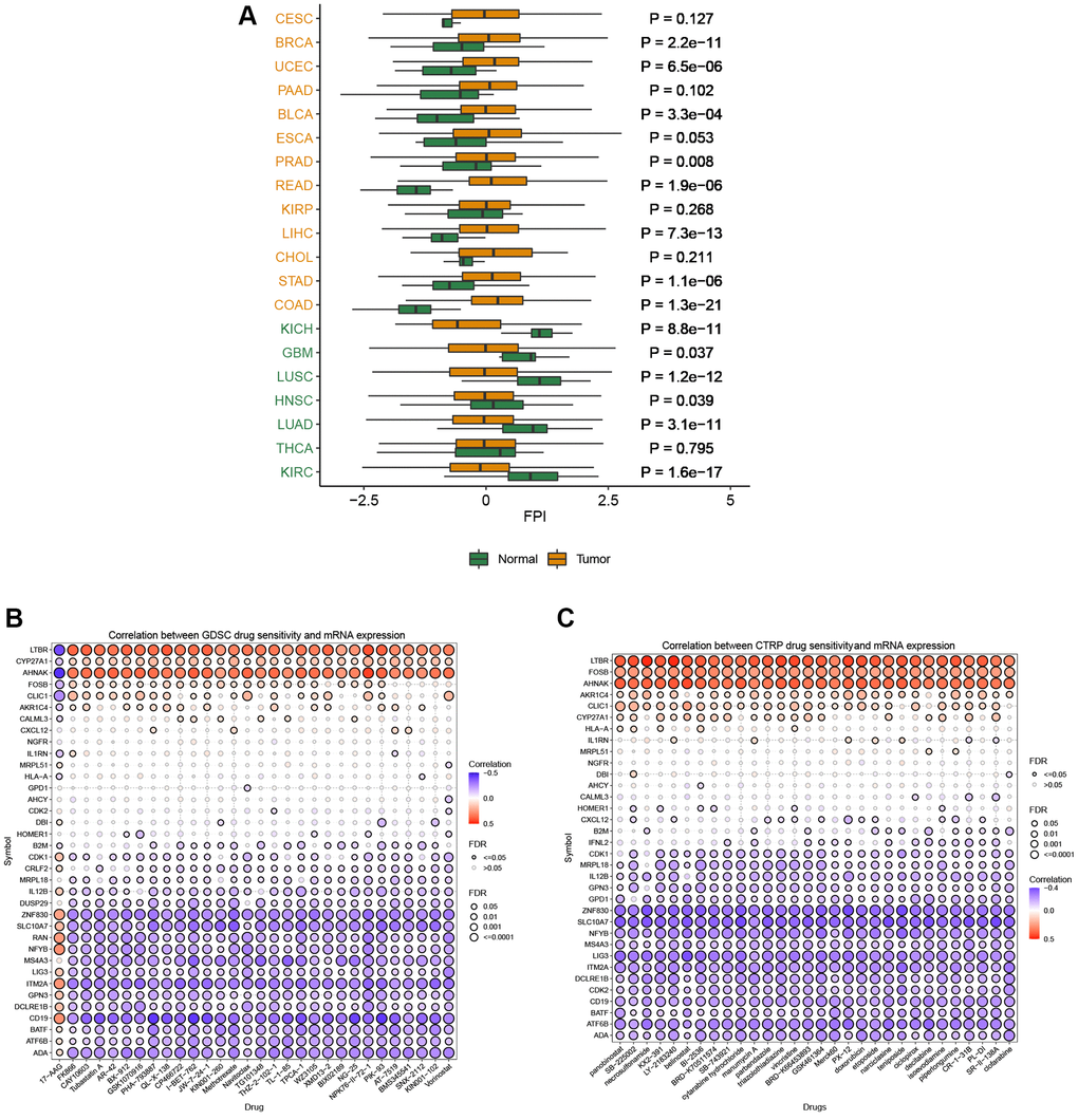 To examine the activity changes of T-cell proliferation regulatory genes in different tumors, we utilized ssGSEA to calculate the enrichment score (ES). By subtracting the ES of T-cell proliferation negative regulatory genes from the ES of T-cell proliferation positive regulatory genes, we obtained an activity score. The Gene Set Cancer Analysis incorporates drug and gene expression information from two databases: GDSC (https://www.cancerrxgene.org) and CTRP (https://portals.broadinstitute.org/ctrp/). GDSC includes IC50 values for 265 small molecules across 860 cell lines, along with corresponding mRNA gene expression data. CTRP compiles IC50 values for 481 small molecule drugs across 1001 cell lines, also accompanied by mRNA gene expression information. Pearson correlation analysis was performed to assess the correlations between gene mRNA expression and drug IC50 values.