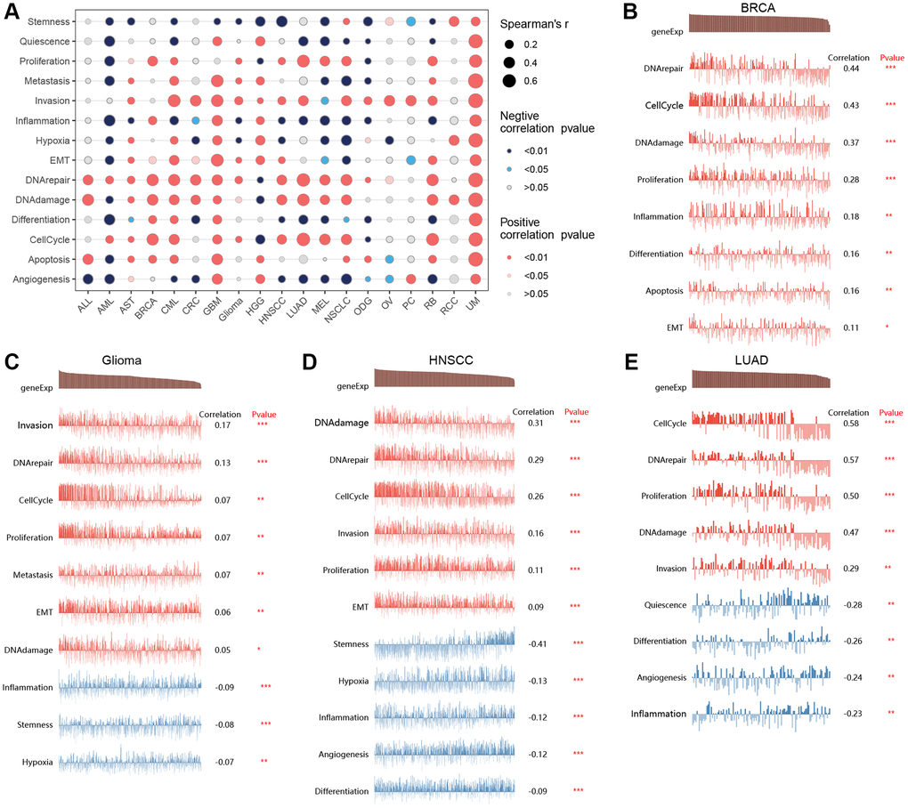By integrating single-cell datasets, we analyzed the correlation between T-cell proliferation regulatory genes and cancer-related functional states (Figure 9A), and found that there was a correlation between T-cell proliferation regulatory genes and different cancers and functional states. Figure 9B–9E shows the correlation between T-cell proliferation regulatory genes and cancer-related functional states in BRCA, Glioma, HNSCC, and LUAD, respectively.