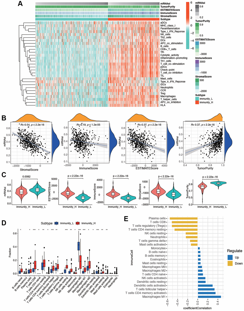 We evaluated the immune status of tumor samples by employing the ssGSEA method on the transcriptomes of TCGA endometrial cancer specimens. This assessment incorporated 29 immune-related pathways and assessed the presence of infiltrating immune cells to estimate the immune profile of EC tissues (Figure 2A). The total TCGA cohort were clustered into 2 subgroups (low immunity: 221 samples, and high immunity: 293 samples) by applying unsupervised consensus clustering analysis (Supplementary Figure 2A). There was significant distinction existed on the transcriptional profile among these two immunity modification clusters (Supplementary Figure 2B). By stratifying the TCGA dataset into low and high immunity groups through unsupervised consensus clustering analysis, we categorized patients into two distinct subgroups, namely ‘immunity_H’ and ‘immunity_L.’ It was evident that the ‘immunity_H’ signature was linked to a more favorable prognosis, while the ‘immunity_L’ group exhibited worse survival outcomes (Supplementary Figure 2C). Several parameters were applied to estimate the immune infiltration profiles, including tumor purity, ESTIMATE score, immune score, and stromal score. The distribution of these scores is obviously different in immune subgroups (Supplementary Figure 2D). In addition, the low immunity group exhibited significantly lower HLA related gene set expressions (Supplementary Figure 2E). The distinction between the two immune subtypes may be attributed to the intricate nature of the tumor microenvironment (TME). To investigate the biological disparities between these clusters, we employed the ssGSEA algorithm to assess the prevalence of 28 distinct immune cell types within the immune-infiltrated microenvironment of EC. The findings indicated a significantly higher level of immune infiltration in ‘Immunity_H’ compared to ‘Immunity_L’ cluster, as evidenced by a more pronounced activation of immune response-related cells. Next, we investigated the association between mRNAsi and ESTIMATE-related scores. As shown in Figure 2B, mRNAsi was evaluated and found to be significantly negatively correlated with stromal score (p < 2.2e-16), immune score (p < 1.2e-05), and ESTIMATE score (p < 2.2e-16) in EC. Moreover, the results also revealed that the mRNAsi had an evident positive correlation with tumor purity (p < 2.2e-16). Then the mutation score and ESTIMATE score were compared between immunity_H and immunity_L groups. According to the results, the immunity_H had an obviously lower mRNAsi, tumor purity score, and higher ESTIMATE score, immune score, and stromal score compared with the immunity_L group in the dataset (p < 2.2e-16, Figure 2C). To explore if the high or low immunity status could affect the status of tumor immune microenvironment, tumor-infiltrating immune cells (TIICs) between different immunity groups were compared. The results exhibited that no significant differences were observed between two groups in abundance of the rest immune cells (Figure 2D). As shown in Figure 2E, the stemness index was significantly positively correlated with Macrophages M1 (R = 0.46, p < 0.01), activated CD4 T memory cells (R = 0.35, p < 0.01), T cells follicular helper (R = 0.34, p < 0.01), and activated dendritic cells (R = 0.29, p < 0.01); meanwhile the stemness index was significantly negatively correlated with plasma cells (R = −0.56, p < 0.01), CD8 T cells (R = −0.52, p < 0.01), Tregs (R = −0.51, p < 0.01), and resting CD4 T memory cells (R = −0.47, p < 0.01). These results indicated that immunity subgroups could have strong correlation with TME in EC.