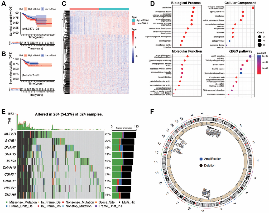 Initially, a Kaplan-Meier curve was generated to examine the impact of mRNAsi values on the prognosis of EC patients. It was observed that patients with lower mRNAsi values experienced an extended overall survival (p = 0.033) and DFS (p = 0.037, Figure 3A, 3B), progression-free survival (PFS, p = 0.081, and disease-specific survival (DSS, p = 0.049, Supplementary Figure 3A, 3B). To further find out novel genes that play essential roles in EC microenvironment associated with stemness index, we grouped the samples based on the median of the mRNAsi, and then we conducted a differential analysis between the high and low-mRNAsi samples. The DEGs were displayed in the heatmap (Figure 3C) and volcano (Supplementary Figure 3C). The results showed that there were 1,290 DEGs between high and low mRNAsi groups, including 117 significantly upregulated genes and 1,173 significantly downregulated genes. GO and KEGG pathway analysis of DEGs exhibits intriguing results. In GO functional analysis, microtubule-based movement, extracellular matrix structural constituent, and collagen-containing extracellular matrix were enriched. The expression levels of the correlated genes in the enriched KEGG pathways are also displayed, including cAMP signaling pathway, Wnt signaling pathway, and Hippo signaling pathway (Figure 3D). Moreover, the mutation characteristics of DEGs in each EC sample are visually represented in a waterfall plot (Figure 3E), allowing for the analysis of distinct mutation types associated with individual genes contributing to EC progression. The rest of the mutation analysis are shown in Supplementary Figure 3D–3I. Comparing the two clusters, the differential analysis of copy number variations showed that, in the high mRNAsi group, 20 (16.7%) genes had significant amplifications, and 11 (7.2%) genes had significant deletions, in contrast to the low mRNAsi group (Figure 3F). All these results revealed that different mRNAsi subgroups had diverse survival and DEGs from high or low mRNAsi group might play a pivotal role in progression and somatic mutation in EC patients.