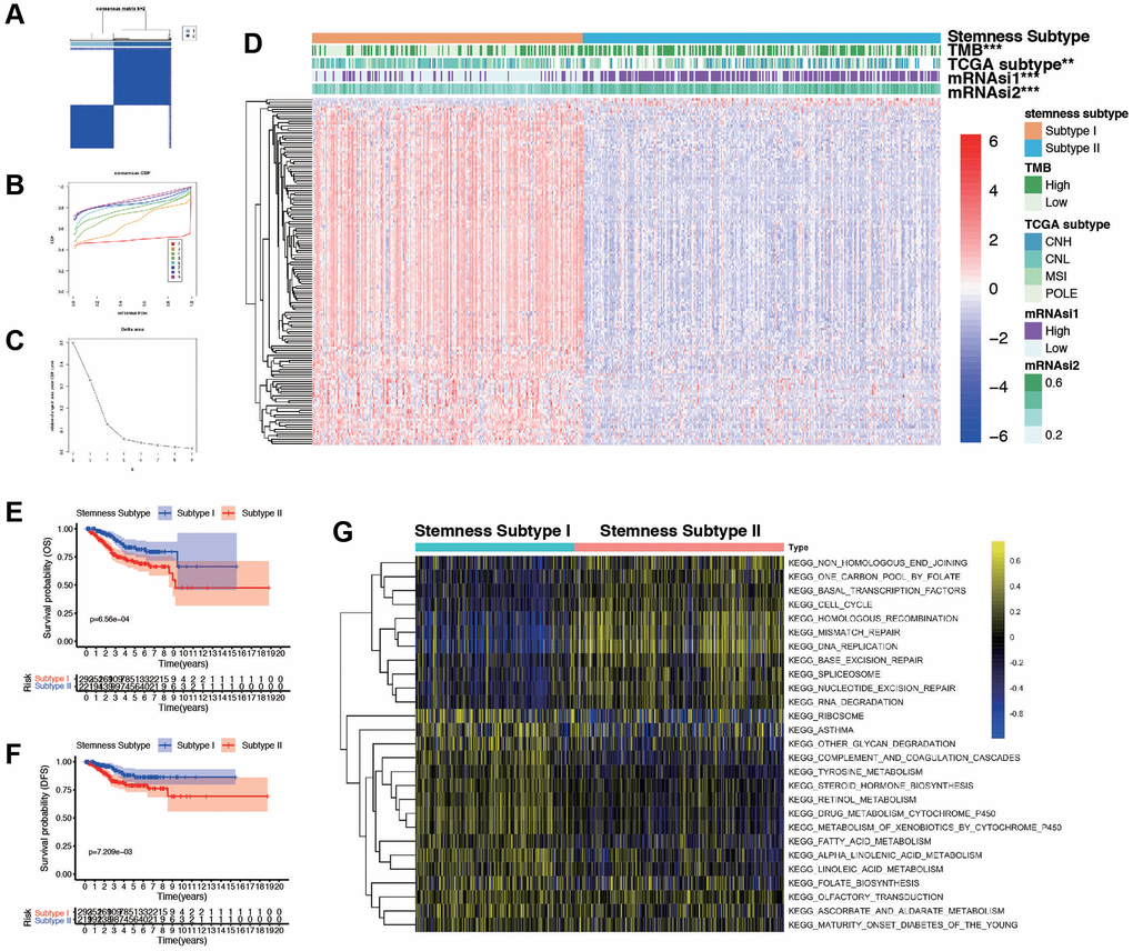 ConcensusCluster analysis was utilized to classify the EC samples based upon the DEGs from high and low-mRNAsi subgroups. As depicted in Figure 4A–4C and, we determined that selecting k = 2 was a sound decision, given the increase in cluster stability from k = 2 to 10. Additionally, we employed PCA analysis to explore the features of DEGs, using the k = 2 classification among EC patients (Supplementary Figure 4A). Heatmap was plotted to show the distribution of gene expression and mutation information, including TMB, TCGA subtypes, and mRNAsi are significantly different in two subtypes (Figure 4D). High TMB, high mRNAsi, and worse TCGA subtypes are enriched in subtypes II. Furthermore, we found that the two subtypes were associated with OS (p = 6.56e-04, Figure 4E), DFS (p = 7.21e-03, Figure 4F), and PFS (p = 1.66e-02, Supplementary Figure 4B), but not associated with DSS (p = 3.11e-01, Supplementary Figure 4C). To further explore the biological behaviors between distinct subtypes, we conducted GSVA and found that stemness subtype II presented enrichment pathways associated with tyrosine metabolism, steroid hormone biosynthesis, retinol metabolism, and fatty acid metabolism. Stemness Subtype I tumors mainly correlated with basal transduction factors, cell cycle, mismatch repair, and RNA degeneration (Figure 4G). According to these implications, the mRNAsi-related DEGs could categorized patients into two subtypes, and patients in two subtypes had diverse characteristics. Differentiating these functions of patients may occur in GSVA related results.