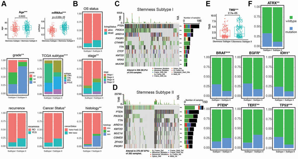 To further explore the relationship between stemness subtypes and clinicopathological characteristics, we compare different clinical features in Stemness Subtype I and II. As shown in Figure 5A, patients in the Stemness Subtype I group were significantly lower in age (62.5 ± 22.4 versus 64.9 ± 24.1 years, p = 0.0023) and mRNAsi (0.35 ± 0.22 versus 0.44 ± 0.25, p < 2.22e-16) than those in the Stemness Subtype II group. The clinical factors in Stemness Subtype I was significantly different from that in the Stemness Subtype II group, such as grade, TCGA subtypes, stage, cancer status, and histological types (Figure 5B). However, the distribution of stemness subtypes were not correlated with OS status, recurrence, LNM, and peritoneal cytology (Supplementary Figure 5A, 5B). As shown in Figure 5C, 5D, subtype I group presented less extensive tumor mutation burden than the subtype II group. The box diagram of each color represents a kind of mutation (Supplementary Figure 5C, 5D). The value of TMB is much higher in Stemness Subtype groups (p = 2.7e-05, Figure 5E). We then compare the mutation occupation of key genes for EC. The same situations were observed for ATRX, BRAF, EGFR, IDH1, and TP53, indicating that the mutation frequencies of ATRX (I versus II, 30.8% versus 12.5%; P < 0.01), BRAF (I versus II, 29.1% versus 13.2%; P < 0.001), EGFR (I versus II, 30.2% versus 17.4%; P < 0.05), IDH1 (I versus II, 25.1% versus 13.2%; P < 0.05), and TP53 (I versus II, 27.5% versus 9.2%; P < 0.001) in the Stemness Subtype II group were significantly higher. Whereas, mutation frequencies of PTEN (I versus II, 16.3% versus 26.8%; P < 0.05) and TERT (I versus II, 13.3% versus 34.8%; P < 0.01) between the two subtypes in the Stemness Subtype I group were significantly higher (Figure 5F). Finally, we proved that the stemness subtype groups are diverse in clinicopathological features and key somatic mutations, which may indicate us these mutational genes play an essential in the progression derived from stem cells in EC.