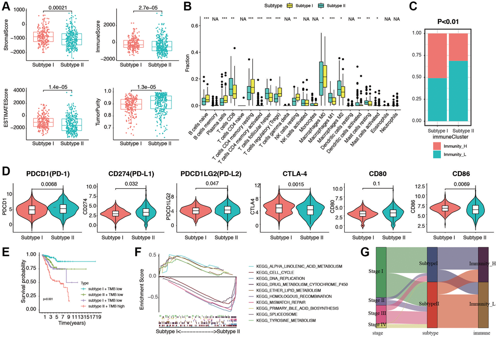 Next, ESTIMATE score and purity score in two stemness subtypes were compared. As shown in Figure 6A, stromal score, immune score, and ESTIMATE score were much higher in subtype I group (all p < 0.05). In contrast, tumor purity score was much higher in Subtype II group (p = 1.3e-05). To investigate the correlation between TIICs and stemness subtypes in EC, we first used CIBERSORT to calculate infiltration of 22 immune cells in the EC cases. Then, we compared the infiltration of 22 immune cells in stemness subtype I and II groups. The difference analytical results showed that naive B cells, plasma cells, CD8 T cells, T cells CD4 memory resting, T cells CD4 memory activated, T cells follicular help, Tregs, NK cells resting, Macrophages M0/M1/M2, Mast cells resting, Mast cells activated were significantly different in two groups (Figure 6B). Furthermore, consistent with the findings of previous studies, the proportion of immunity_H decreased from Stemness Subtype I (49.3%) to Stemness Subtype II (31.3%, Figure 6C). The part of high TMB group occupied more in Stemness Subtype II group (Supplementary Figure 6). In addition, to investigate the immunotherapy and response in two stemness subtypes, we compare the expression of related genes in two groups (Figure 6D). We then combined the subtype with TMB score, and divided the cohort into for subgroups according to subtypes and low/high TMB score. The results showed that patients in subtype I and low TMB subgroup had the best prognosis, and patients from subtype II, high TMB subgroup tended to survive shorter than the patients from other subgroups (Figure 6E). Next, GSEA was then performed, subtype I was enriched in cell cycle, DNA replication, and ether lipid metabolism, and subtype II patients were enriched in mismatch repair, primary bile acid biosynthesis, and tyrosine metabolism (Figure 6F). We visualized a Sankey map to illustrate the connections among stage, subtype, and immune status. The results indicated that patients in stage IV were primarily associated with Stemness Subtype II and displayed lower immune infiltration (Figure 6G). These intriguing findings underscore that Stemness Subtype I tumors exhibit comparatively low levels of immune infiltration and high tumor purity, while also having relatively elevated immune activity.