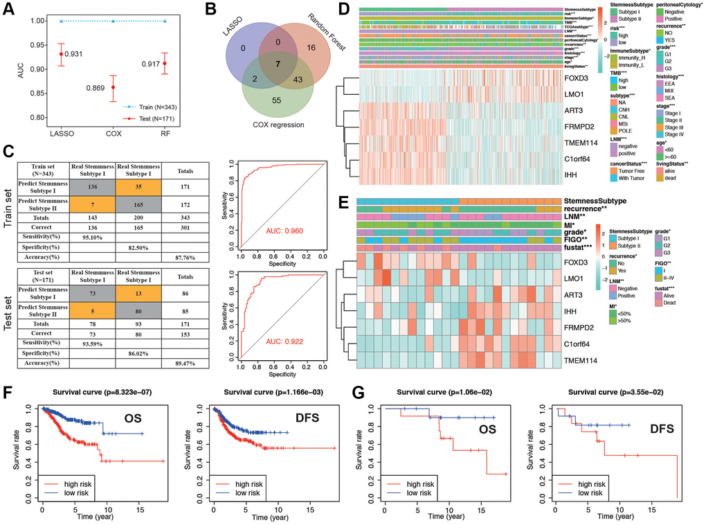 We proceeded to split the patients into a training set and a validation set, maintaining a 2:1 ratio. Initially, in the training set, we applied three distinct machine learning algorithms to discern the most crucial stemness subtype-related features based on the expression levels of 1,290 stemness-related DEGs. Simultaneously, time-dependent AUC analysis revealed that the stemness subtype score exhibited substantial predictive value for the Overall Survival (OS) of EC patients within the TCGA dataset. Figure 7A illustrates that LASSO regression yielded the highest AUC, standing at 0.931 in the validation set, as reflected in the corresponding coefficient in Supplementary Table 2. A total of 9, 66, and 107 genes were identified by LASSO, random forest (RF), and Cox regression, respectively (Supplementary Figure 7A–7E). By overlapping the DEGs of the three machine learning methods, we obtained a total of 7 common genes (Figure 7B). Coefficient was shown in Supplementary Table 3. Risk score was calculated with the 7 genes as following: risk score= −(ART3 × 1.120) −(C1orf64 × 0.763) + (FOXD3 × 0.868) −(FRMPD2 × 0.621) −(IHH × 0.263) + (LMO1 × 0.582) −(TMEM114 × 1.434), and divided the patients into low and high groups. Stemness Subtype Predictor also had an excellent performance in discriminating the stemness subtypes as evaluated in the test set (Figure 7C). The expression of the 7 genes subtype I and II patients in the TCGA dataset was also demonstrated in the heatmap (Figure 7D). We observed significant distinctions between subtype I and subtype II groups concerning factors such as risk, immune subtype, Tumor Mutational Burden (TMB), TCGA molecular classification, cancer status, peritoneal cytology, recurrence, grade, histology, stage, age, and survival status. Subsequently, we validated the seven genes along with their associated clinicopathological features within different stemness subtypes in our hospital cohort. As shown in Figure 7E, the patients in our center also confirmed that there was a significant difference in the distribution of clinicopathological characteristics between the two groups. K-M survival analysis indicated that patients in low risk group presented significantly better OS and DFS in both the TCGA and EC cohorts (Figure 7F, 7G). PFS and DSS in TCGA group showed a similar result (Supplementary Figure 7F, 7G). The accuracy of risk model prediction was verified by ROC curve, and the results confirmed that all AUCs of survival prediction was greater than 0.7 (Supplementary Figure 7H–7K). Cohort in our hospital proved that the AUCs of OS and PFS were 0.82 and 0.85, respectively (Supplementary Figure 7L, 7M). Finally, we validated the expression of the 7 genes with normal endometrium and EC tissues by western blot in protein level. The results were shown in Supplementary Figure 8, which is also corresponding with the sequencing results. These findings demonstrate that the classification derived from comprehensive analyses exhibited superior performance, both in the TCGA dataset and among patients in our hospital.