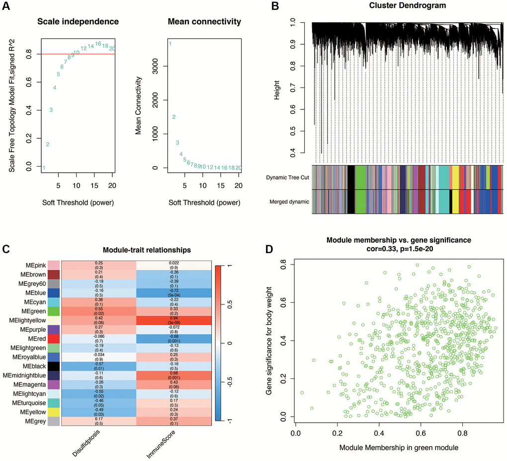 In diabetic nephropathy, to further obtain genes associated with disulfidptosis, WGCNA analysis was performed in the GSE30122 dataset. As shown in Figure 3A, when the optimal soft threshold is 14, the data conforms to the power law distribution. As shown in Figure 3B, 3C, the genes were clustered into 17 non-gray modules, with the green module most associated with the disulfidptosis phenotype (cor = 0.55 and p < 0.05). We further explored the inter-gene correlation in the green module, as shown in Figure 3D. There was a positive correlation between Module membership in green module and Gene significance for body weight (cor = 0.33 and p < 0.05).