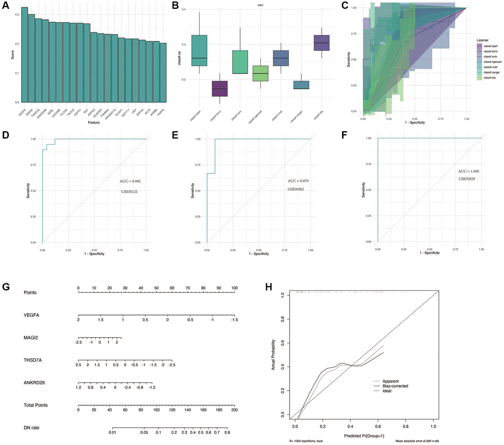 We performed the analysis in GSE30122. As shown in Figure 5A, the first four important genes were VEGFA, MAGI2, THSD7A and ANKRD28. Subsequently, a variety of machine learning methods were used and compared, as shown in Figure 5B, 5C. Compared with other models, “KNN” method has the highest accuracy and the largest AUC area. As shown in Figure 5D–5F, this model performs well in training cohort GSE30122 and verification cohorts GSE30528 and GSE30529, with AUC greater than 0.9. For better clinical application, we constructed a nomogram, as shown in Figure 5G, 5H, to accurately predict the possibility of diabetic nephropathy by combining the expression of four genes.