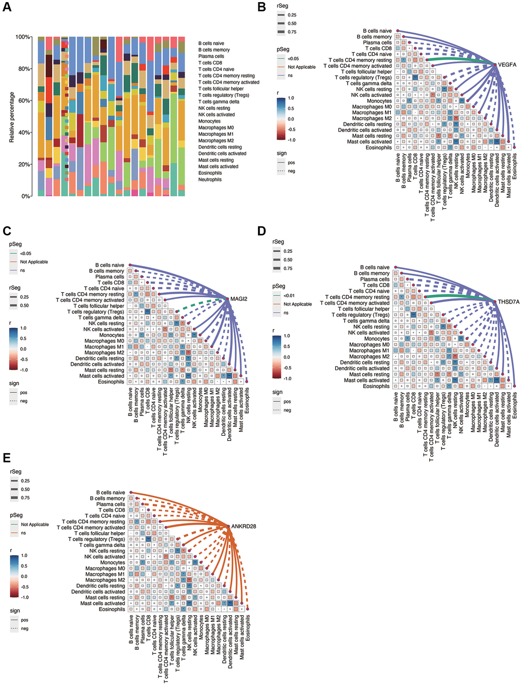 Figure 6A shows the immune infiltration of each sample in diabetic nephropathy. As shown in Figure 6B–6E, there is a correlation between immune cells, in which NK Cell resting is positively correlated with Macrophage M2, while Tregs are negatively correlated with T cells CD8. NK Cell resting was negatively correlated with Mast cells activated and Dendritic cells resting. VEGFA was positively correlated with T cells CD4 memory resting (p < 0.05), MAGI2 was negatively correlated with Tregs (p < 0.05), and THSD7A was positively correlated with T cells CD4 memory resting (p < 0.05). No significant correlation was found between ANKRD28 and immune cells.