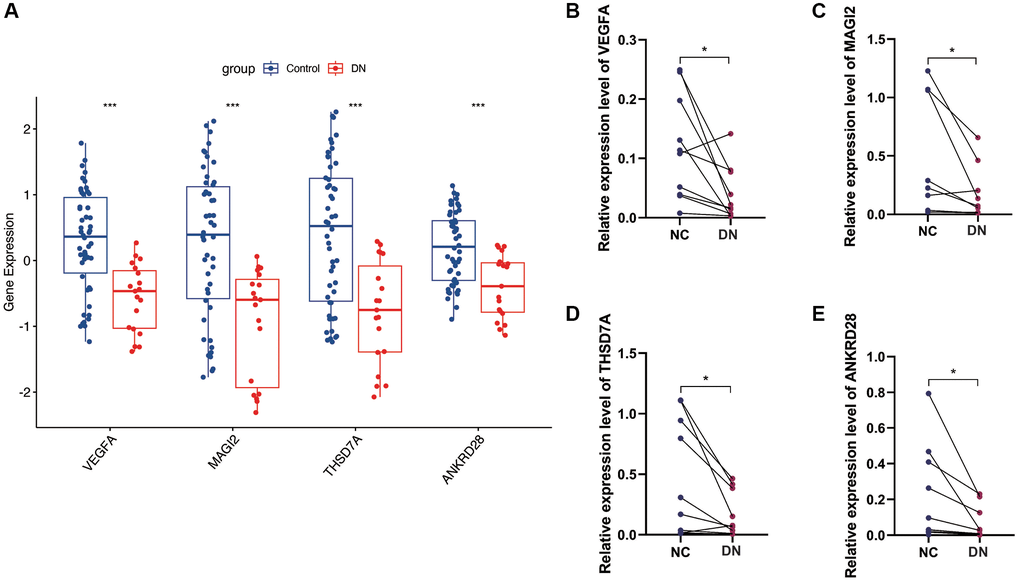 In the GSE30122 cohort, we analyzed the expression of four model genes, VEGFA, MAGI2, THSD7A and ANKRD28, and found that the expression of these model genes was down-regulated in the DN group (Figure 7A). Subsequently, we conducted PCR validation in clinical samples and also found down-regulated expression levels of VEGFA, MAGI2, THSD7A and ANKRD28 in the DN group (Figure 7B–7E) (*p < 0.05, ***p < 0.001).