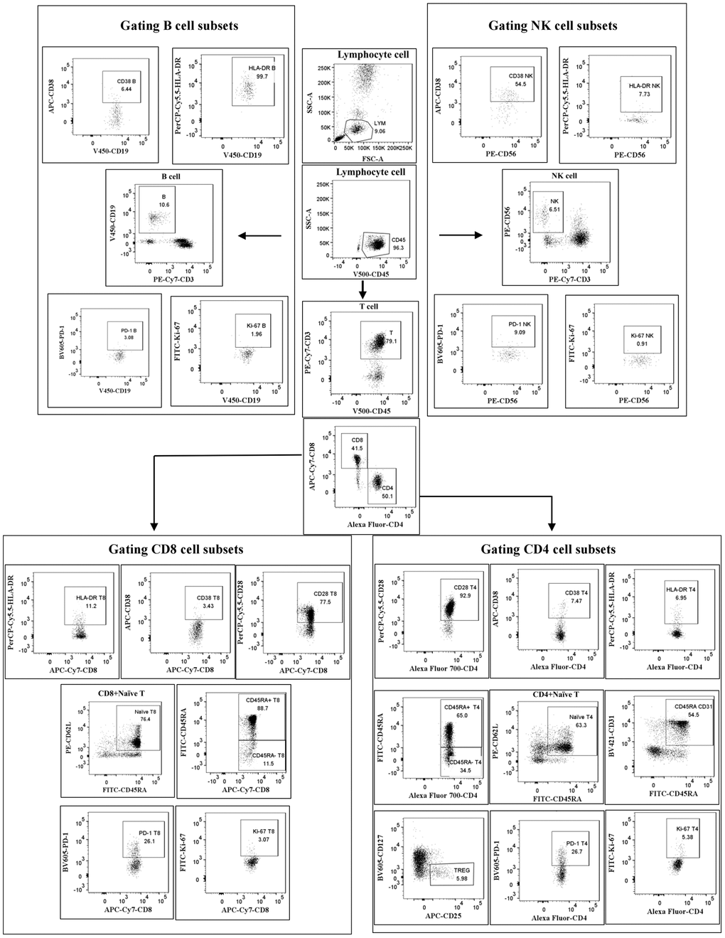 Fresh EDTA-anticoagulated whole blood was collected and treated by flow cytometry within 6 h. Eighteen color flow cytometry (LSRFortessa and trade; BD Biosciences, La Jolla, CA, USA) analyzed peripheral blood lymphocyte subsets. Isolated PBMC from whole blood was incubated and tested with a panel of monoclonal antibodies against: anti-CD56-PE/anti-PerCP-cy5.5-HLA-DR/anti-CD38-APC/anti-CD3-PE-cy7/anti-CD8-APC-cy7/anti-CD4-AF700/anti-CD19-V450/anti-CD45-V500C/anti-PD-1 BV605/anti-CD45RA-FITC/anti-CD62L-PE/anti-CD28-PerCP-cy5.5/anti-CD25-APC/anti-CD127-V450/anti-CD31-BV421. Antibodies for this study were purchased from BD Pharmingen (San Diego, CA, USA). The samples were analyzed using FACSDiva software (Becton Dickens, Franklin Lakes, NJ, USA). The gating strategy for lymphocyte subsets is shown in Figure 1. Cell counts for lymphocyte subsets were calculated using a two-platform approach, where white blood cell counts and lymphocyte differentials were obtained from routine blood tests of the same specimen.
