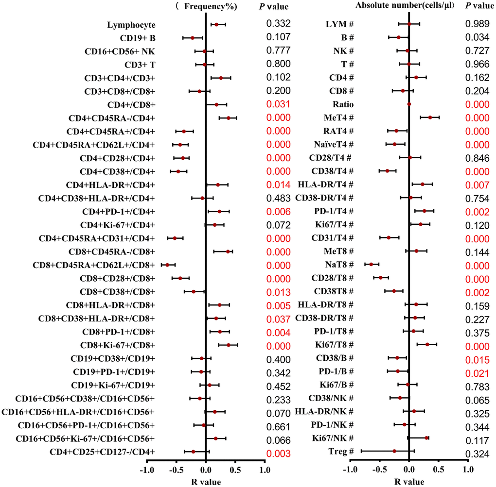 In short, immune parameters are different between young and old populations. We used flow cytometry immunophenotyping to evaluate the counts and percentages of circulating lymphocyte subpopulation in healthy young and elderly individuals, not only validating the reliability of classical aging markers but also discovering an increasing trend of PD-1 on T cell and Ki67 on CD8+ T cell along with aging, providing clues for further research on immunosenescence. These data contribute to a deeper understanding of immune aging. Gender and age have significant impacts on lymphocyte subsets, thus a systematic investigation of various interacting factors related to age-associated immune changes is necessary.