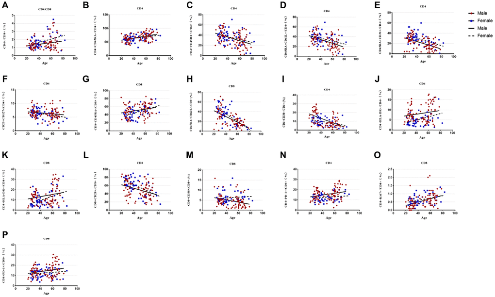 To investigate the influence of the age on the lymphocyte subsets, we divided the subjects into three age groups. A total of 55 (36.6%) were in young adult group (19–44 years old, 34 males, 21 females, mean age 29.2 years), 46 (30.7%) belonged to the middle-aged adult group (45–64 years old, 24 males, 22 females, mean age 52.6 years) and 49 (32.7%) belonged to the elderly (over 65 years, 31 males, 18 females, mean age 68.0 years). The Chi-square tests showed that there were differences between the gender in different age groups. (P = 0.045). We then observed associations between a set of parameters and age (results shown in Figure 2). Most parameters varied with age except for CD19+ B cells (p = 0.304), CD16+CD56+ NK cells (p = 0.727), CD3+ T cells (p = 0.966), CD3+CD4+ T cells (p = 0.162) and CD3+CD8+T cells (p = 0.204), especially a clear association was shown in the CD4 and CD8 T cell subsets combinations. Gender impacts the fluctuation of many physiological parameters, furtherly, the lymphocyte subsets distributions correlated with age in males and females at different stages were evaluated and regression analysis was performed.