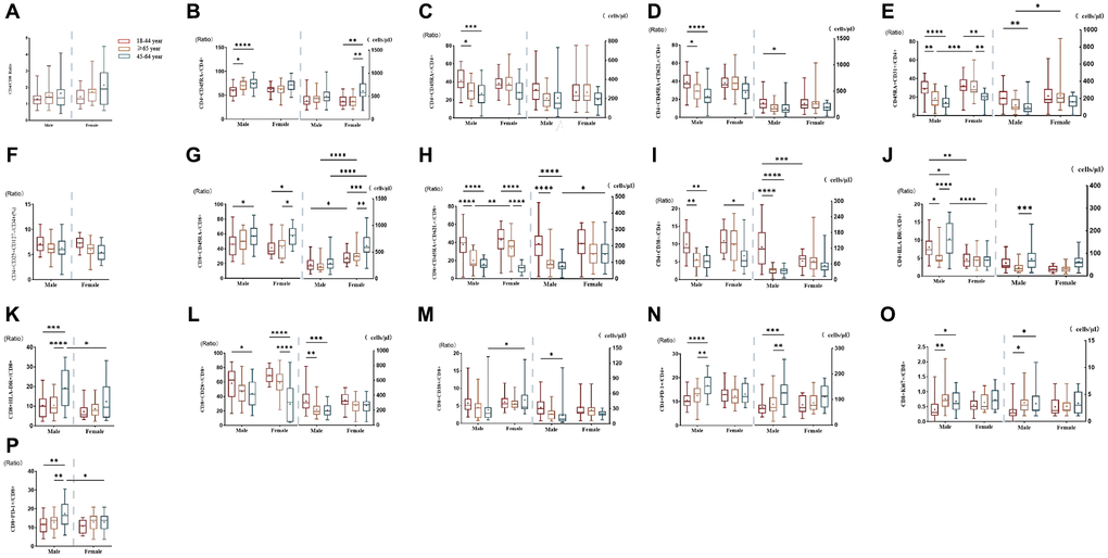 Given previous research, we further evaluated the gender differences in immune aging and the associated phenotypic changes in lymphocyte subsets, including markers PD-1 and Ki67 reflecting peripheral blood exhaustion and proliferation function. It provides a rich perspective on immune aging in the elderly, offering a systematic reference for immune status analysis and clinical diagnosis and treatment.